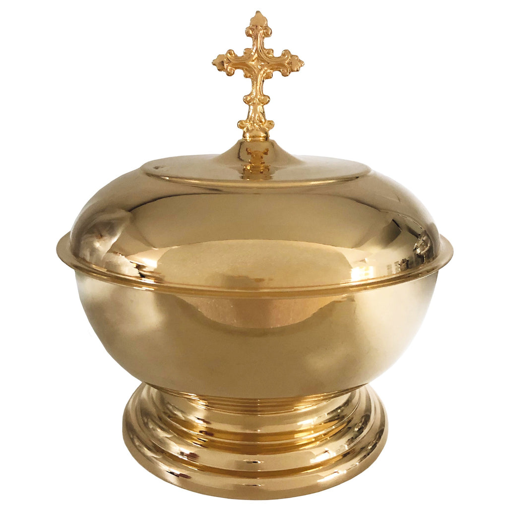 Essas são singelas e práticas âmbulas confeccionadas especificamente para a distribuição da Sagrada Comunhão, feitas com uma pequena base. Confeccionadas em latão, nome dado à liga metálica de cobre e zinco de altíssima qualidade, essa versão é banhada a ouro 24 quilates e acompanha a tampa.