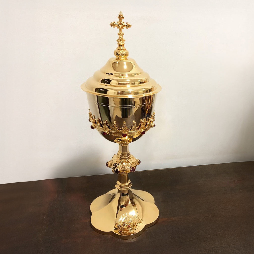 Confeccionada em liga metálica fundida de altíssima qualidade, sendo o copo e a tampa feitas em latão, esta âmbula é banhada a ouro 24 quilates.