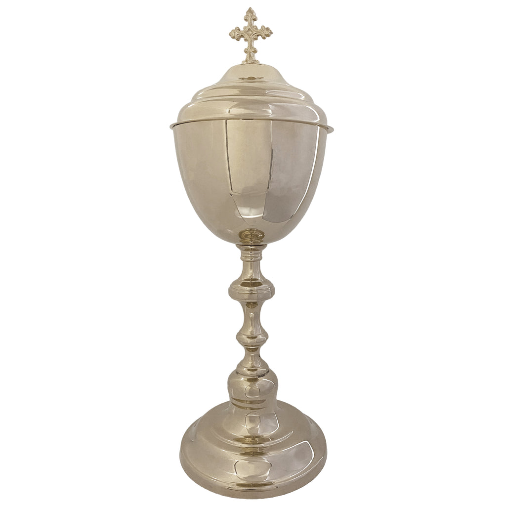 Essa é uma âmbula de formato bastante tradicional, ideal para a celebração cotidiana da Santa Missa, podendo ser utilizada tanto para a distribuição da Sagrada Comunhão, quanto para guardar a reserva eucarística no Sacrário. Confeccionada em latão, nome dado à liga metálica de cobre e zinco de altíssima qualidade, essa versão é banhada a níquel.