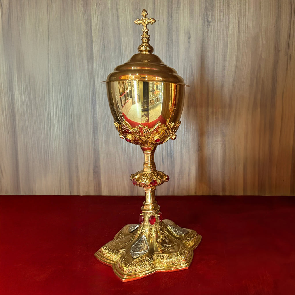 Confeccionada em liga metálica fundida de altíssima qualidade, sendo o copo e a tampa feitas em latão, esta âmbula é banhada a ouro 24 quilates.