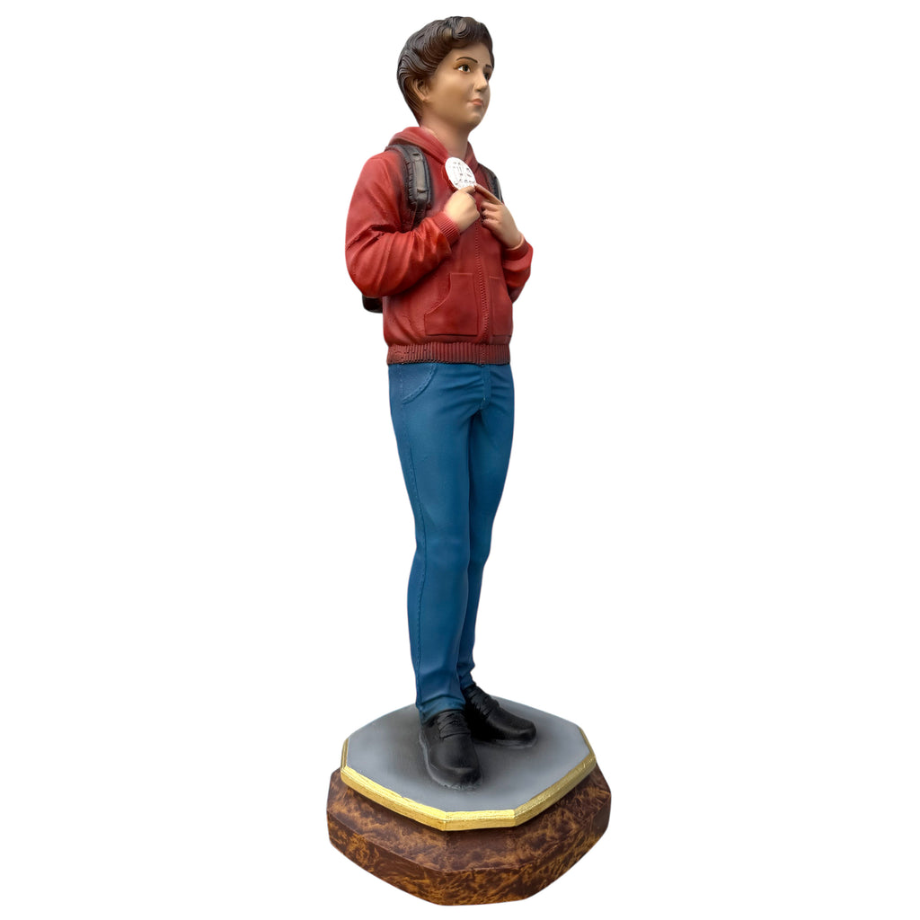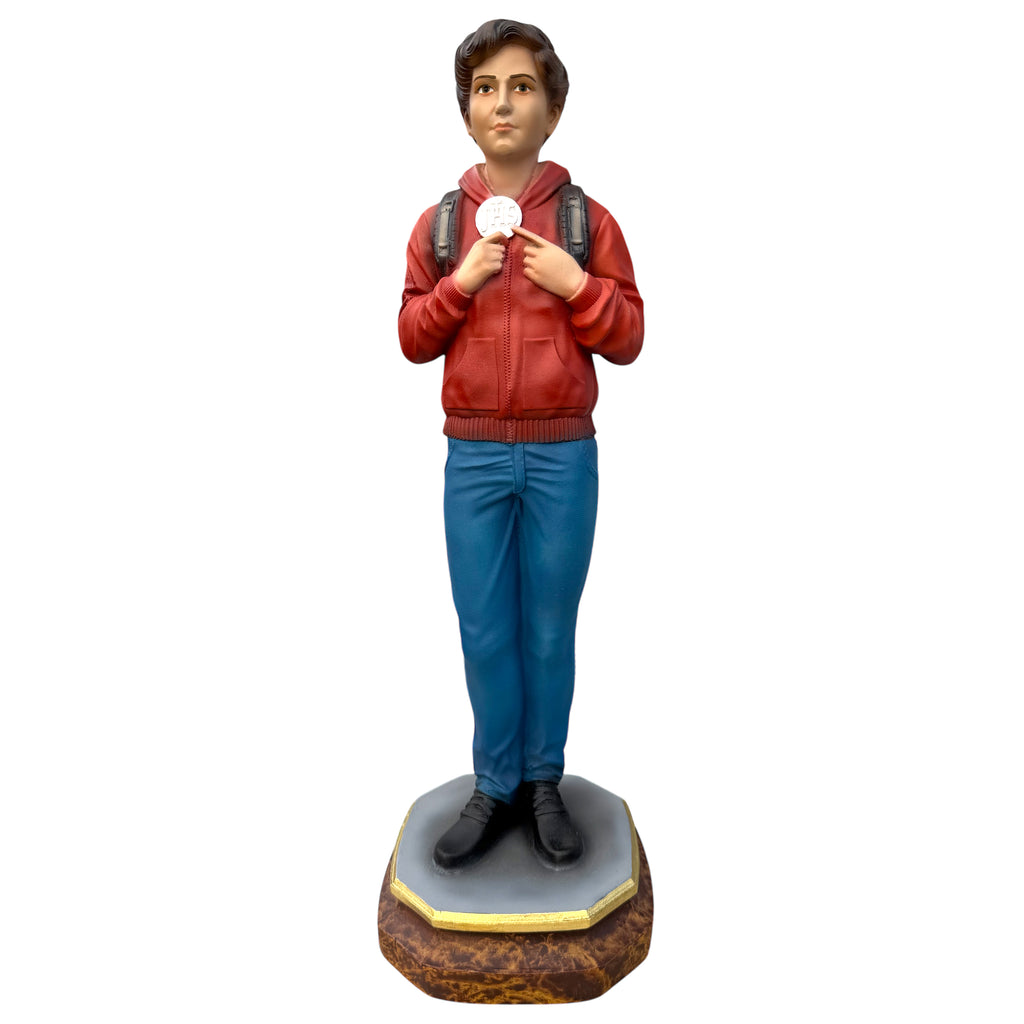 Esta é nossa imagem de São Carlo Acutis (1991–2006), o jovem que dedicou sua breve vida a viver intensamente a amizade com Jesus e a transmitir ao mundo a beleza da Fé Católica. Desde muito cedo, Carlo demonstrava um amor extraordinário pela Eucaristia, a quem chamava de sua “estrada para o céu”. Participava diariamente da Santa Missa, da adoração eucarística e rezava o Rosário com profunda devoção a Nossa Senhora. Ao mesmo tempo, cultivava a caridade concreta, servindo os pobres e os desabrigados com simplicidade e generosidade.