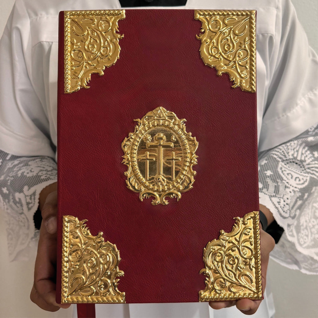 Nossa bela Capa de Missal, própria para a 3ª Edição Típica do Missal Romano, é a opção perfeita para proteger e enobrecer ainda mais o livro mais essencial para a celebração da Santa Missa. Especialmente indicada para grandes festas e solenidades, esta peça reveste o Missal de sua Paróquia de uma estética tradicional indiscutivelmente bela e solene.