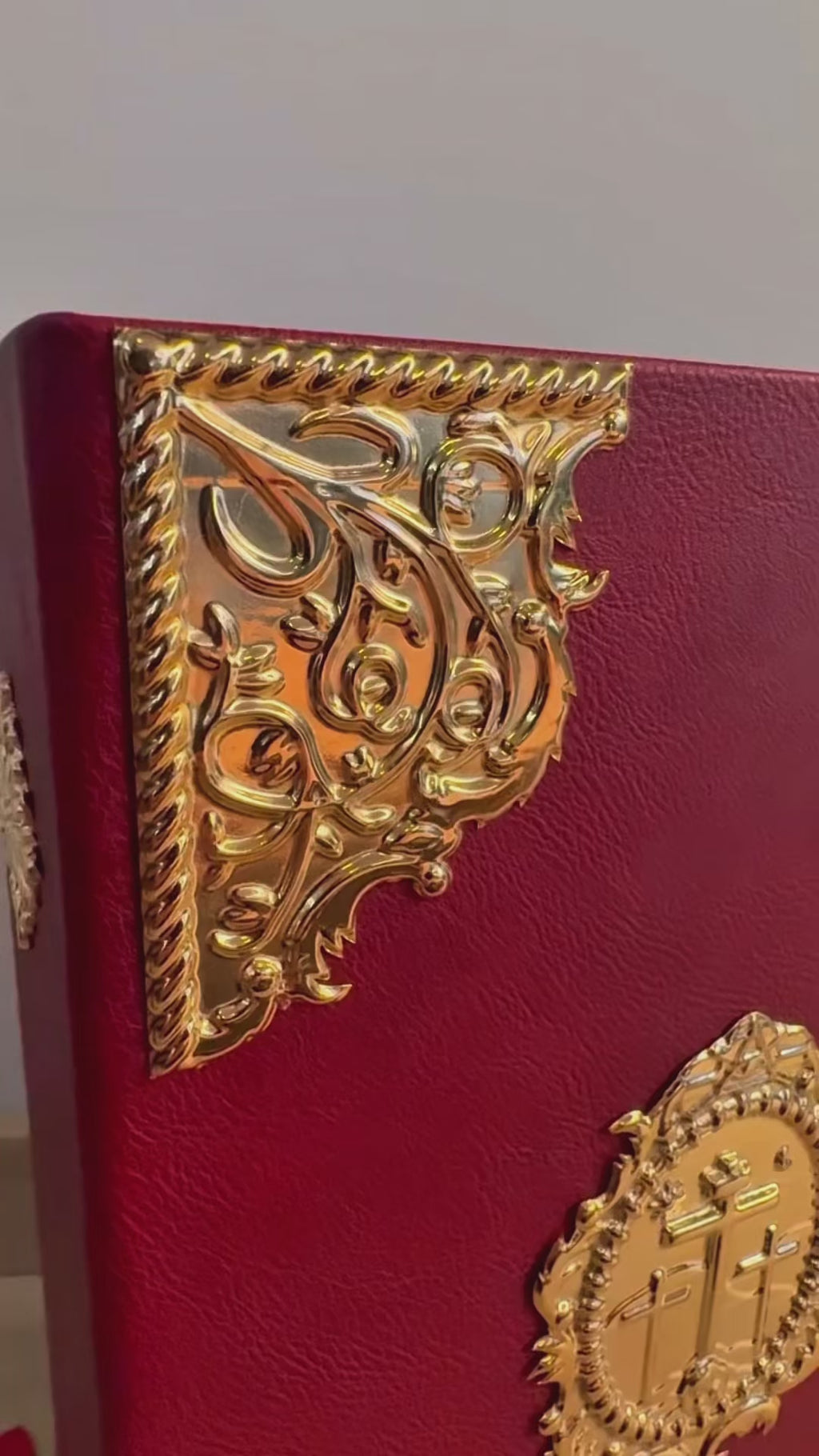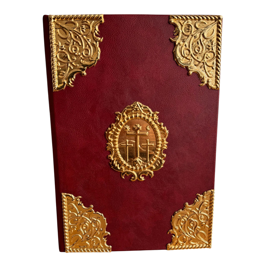 Com revestimento em um belíssimo courvin, recebe 11 ornamentos metálicos banhados a ouro: na capa, 4 ornamentos nos cantos da peça e 1 medalha central, com a representação da cena do Calvário; na parte de trás, 4 ornamentos nos cantos da peça; e, na lateral, 2 arabescos em forma de cruz.