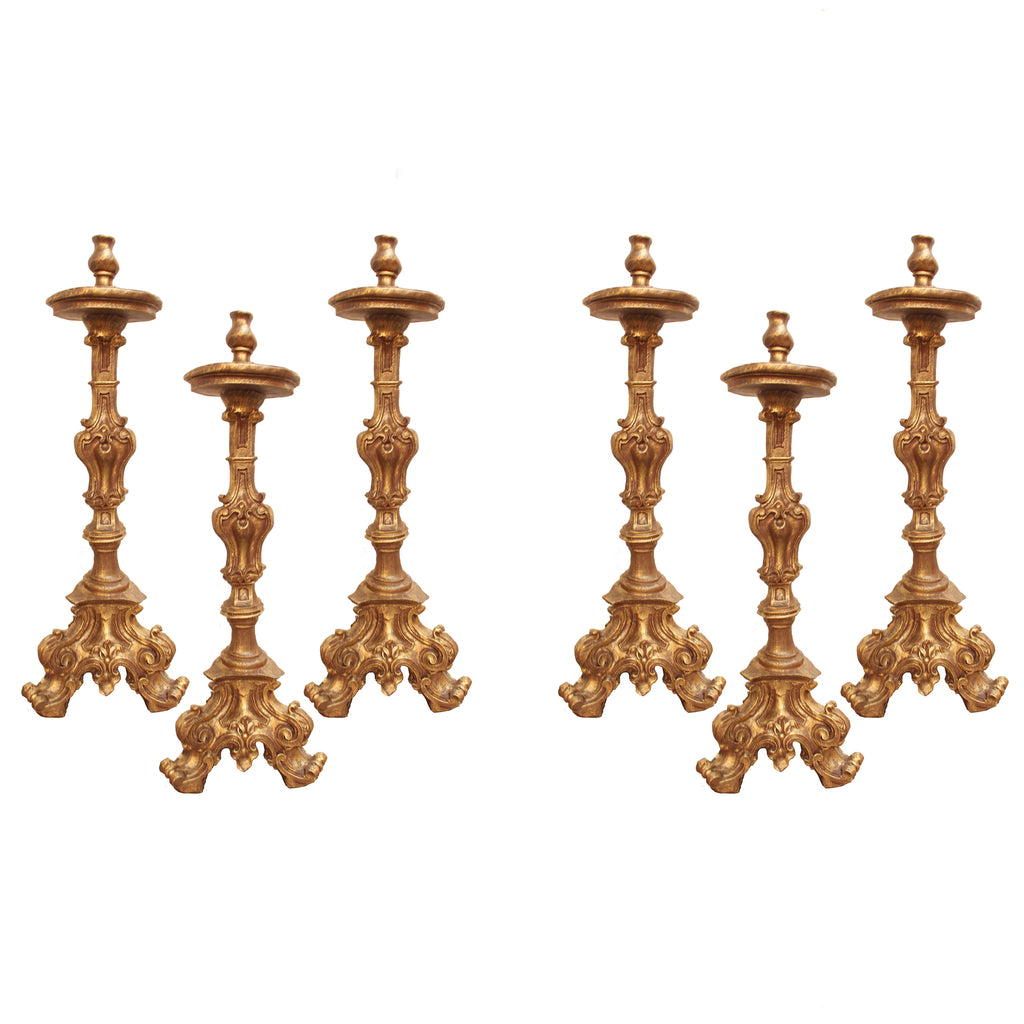 Esse é o nosso conjunto de 6 castiçais de estilo barroco, feitos em resina de alta resistência. Pode ser utilizado sobre a Mesa do Altar ou no Retábulo. Contém 6 peças.