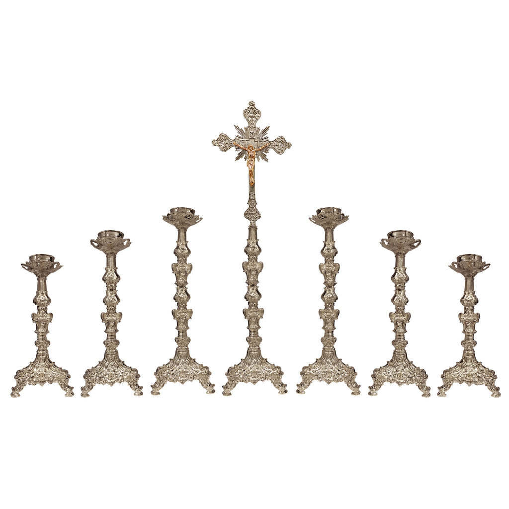 Belíssimo e imponente conjunto de castiçais e Cruz de estilo barroco. Pode ser utilizado sobre a Mesa do Altar ou no Retábulo. Contém 7 peças.