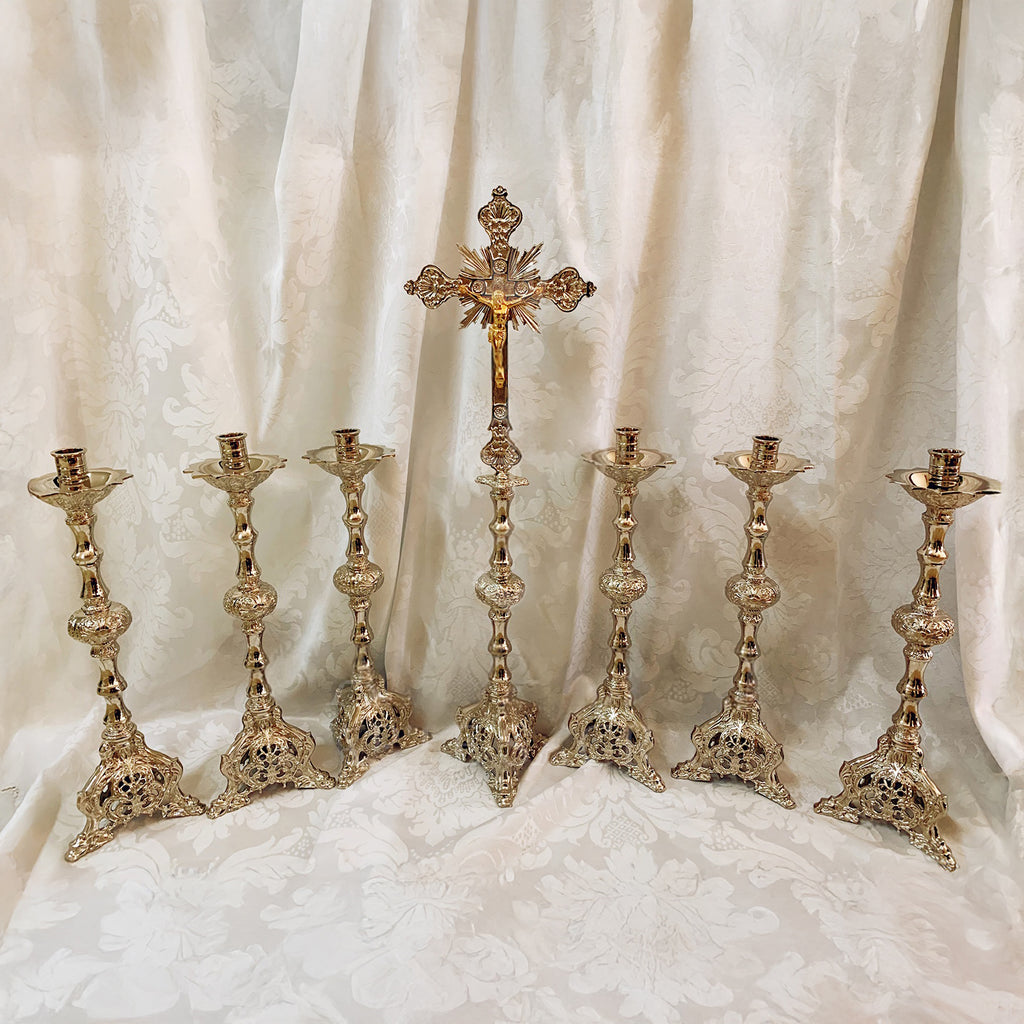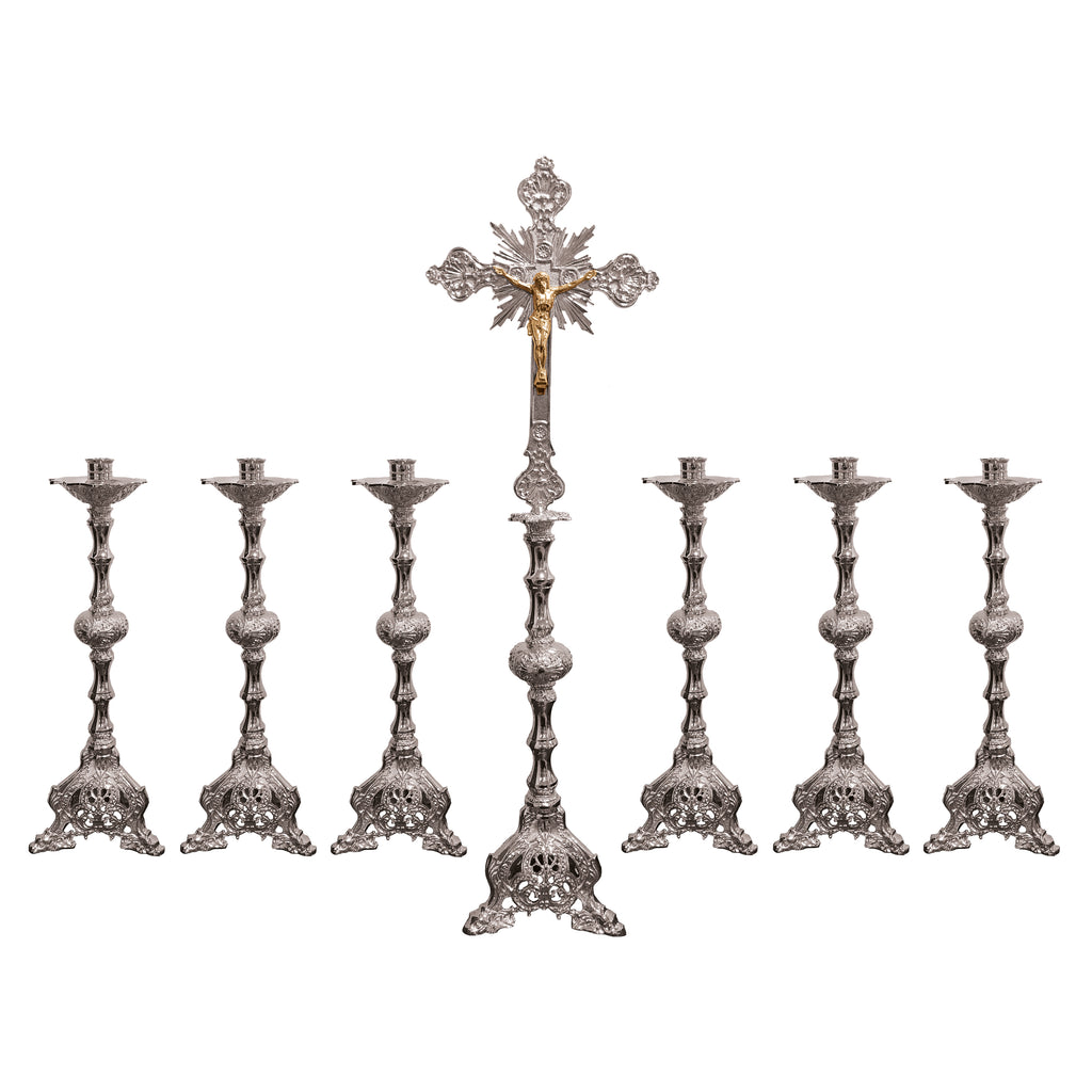 Este é nosso conjunto de castiçais composto de peças com acabamento refinado e ricos detalhes ao longo de toda a estrutura. A parte central da coluna das peças, também chamada de "nó", é composta por três cruzes que o rodeiam. Um conjunto de castiçais como este pode cumular de beleza o Altar de sua igreja ou Matriz Paroquial. Além disso, uma vez disposto em arranjo beneditino, evidencia o caráter da Liturgia Eucarística como oração comunitária, em que tanto o povo quanto o sacerdote estão voltados para o Senhor.