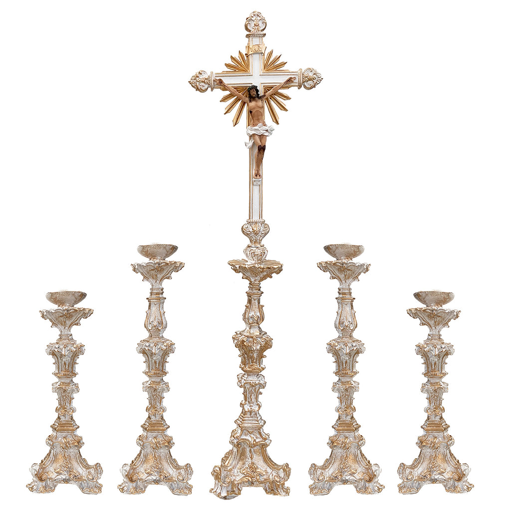 Belíssimo e imponente conjunto de castiçais e Cruz de estilo barroco, feito em resina de alta resistência. Pode ser utilizado sobre a Mesa do Altar ou no Retábulo. Contém 5 peças.