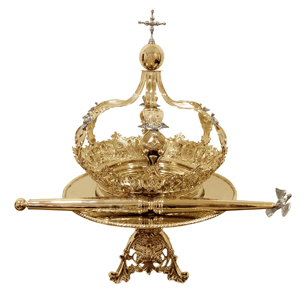 Este é nosso Conjunto de Coroa, Salva e Cetro do Divino Espírito Santo, confeccionados especificamente para uso do Imperador do Divino. São insígnias fundamentais utilizadas nas festividades do Divino Espírito Santo no Domingo de Pentecostes, histórica tradição portuguesa que está presente em muitas Paróquias pelo Brasil. O formato da Coroa é próprio para receber uma cabeça humana, mas também pode ser utilizada em procissões e no presbitério, disposta sobre a Salva.