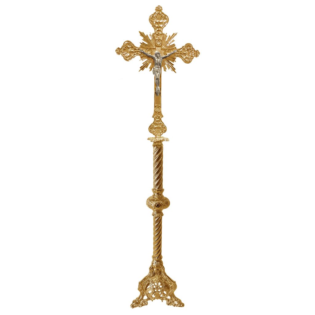 Esta é nossa Cruz de Altar com uma bela e trabalhada coluna em formato espiral, que evidencia ainda mais os detalhes da peça. É ideal para o altar da igreja Matriz de sua Paróquia ou mesmo para uma comunidade.