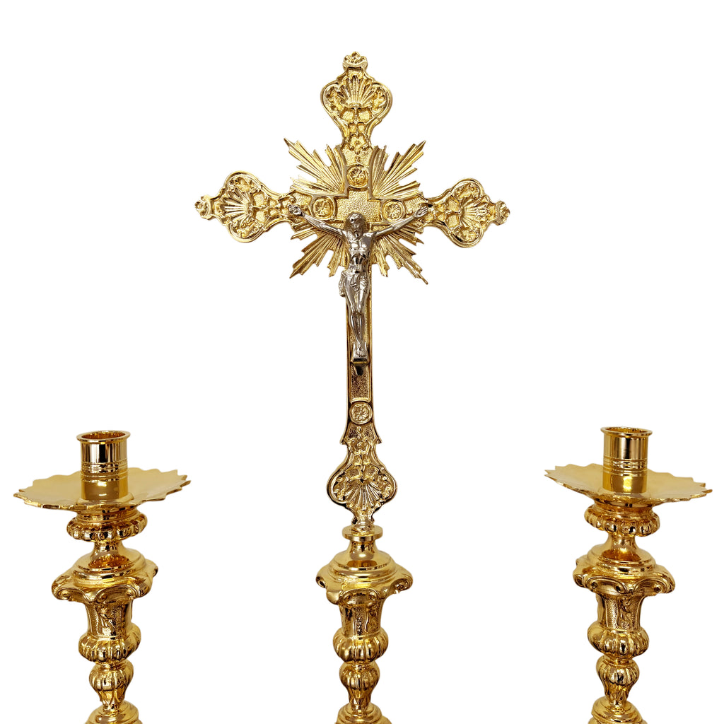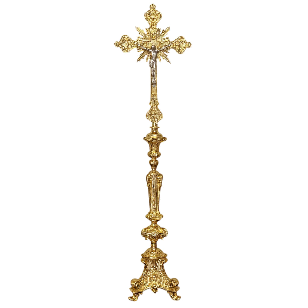 A Cruz de Altar Francesa é assim nomeada por ter um estilo muito particular e característico ao Rococó Francês, caracterizado por linhas curvas, ricos detalhes e uma refinada elegância no acabamento. Na base da peça, encontra-se um busto angélico. É, sem dúvida, uma peça ímpar em dignidade e majestade, como raramente se vê em crucifixos litúrgicos, sendo assim perfeito para celebrações mais festivas e liturgias de grandes solenidades.