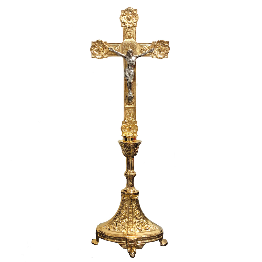 Esta é a singela Cruz de Altar Oval, belíssima peça confeccionada para o uso sobre o Altar na Santa Missa. Ao mesmo tempo que, enquanto disposta em arranjo beneditino, serve à concepção do Altar direcionado para Deus, não ofusca a visão que o celebrante tem do povo e que este tem do sacerdote, quando a Missa é celebrada versuspopulum.