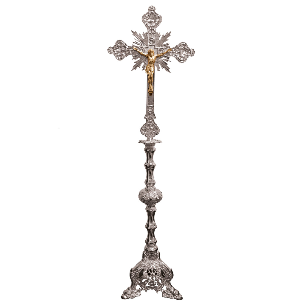 Esta é nossa Cruz de Altar com acabamento refinado e ricos detalhes ao longo de toda a peça. A parte central da coluna, também chamada de "nó", é composta por três cruzes que o rodeiam. Uma Cruz como esta pode cumular de beleza o Altar de sua igreja ou Matriz Paroquial. Além disso, uma vez disposta em arranjo beneditino, evidencia o caráter da Liturgia Eucarística como oração comunitária, em que tanto o povo quanto o sacerdote estão voltados para o Senhor.