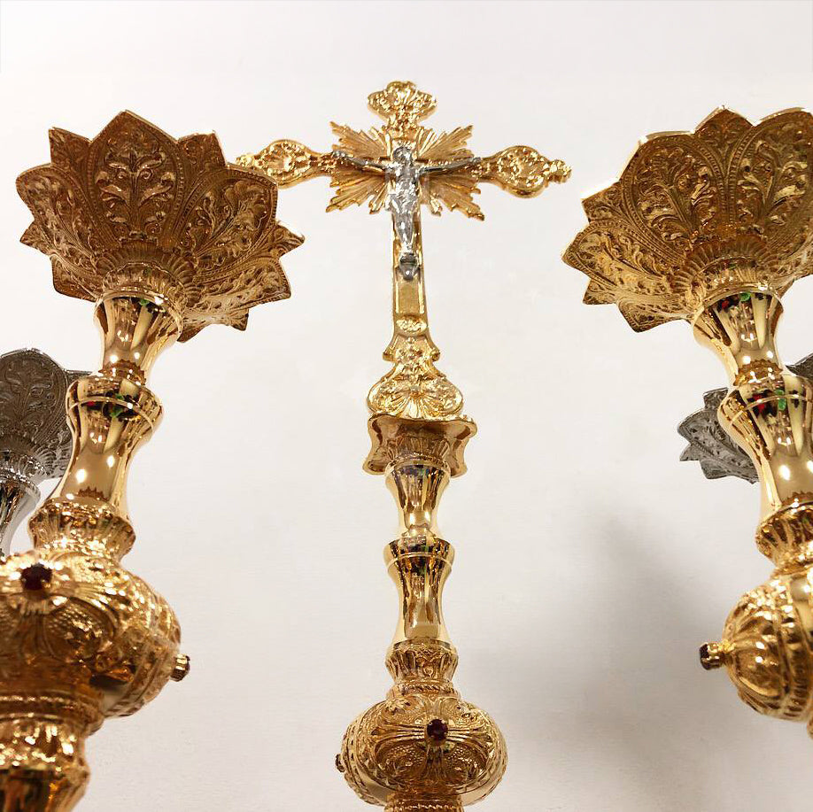 Esta é nossa Cruz de Altar com acabamento refinado e ricos detalhes ao longo de toda a peça. A parte central da coluna, também chamada de "nó", é composta por três cruzes que o rodeiam. Uma Cruz como esta pode cumular de beleza o Altar de sua igreja ou Matriz Paroquial. Além disso, uma vez disposta em arranjo beneditino, evidencia o caráter da Liturgia Eucarística como oração comunitária, em que tanto o povo quanto o sacerdote estão voltados para o Senhor.