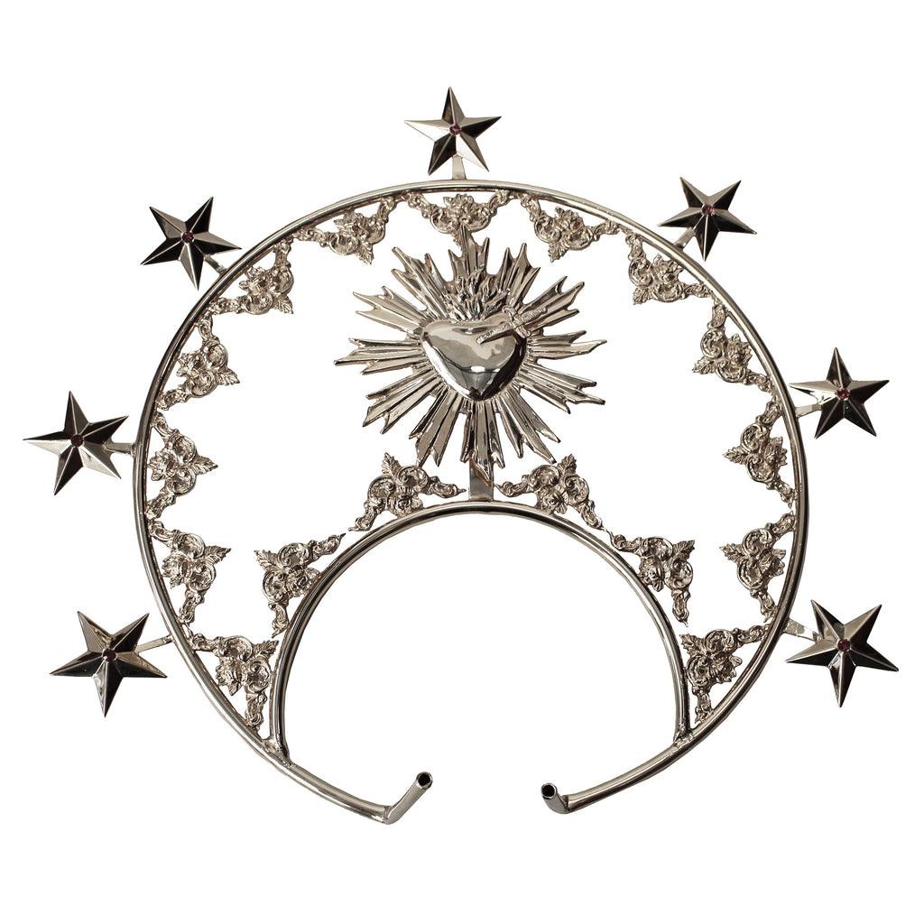 Belíssimo diadema confeccionado em liga metálica fundida de alta qualidade, com acabamento em banho de níquel. Este modelo foi especialmente concebido para imagens de Nossa Senhora das Dores, pois contém as 7 estrelas dispostas em torno da peça, em referência às Sete Dores de Maria Santíssima. Além disso, no centro do diadema, está a representação do Imaculado Coração da Santíssima Virgem, transpassado por uma espada, conforme a Profecia de Simeão:
