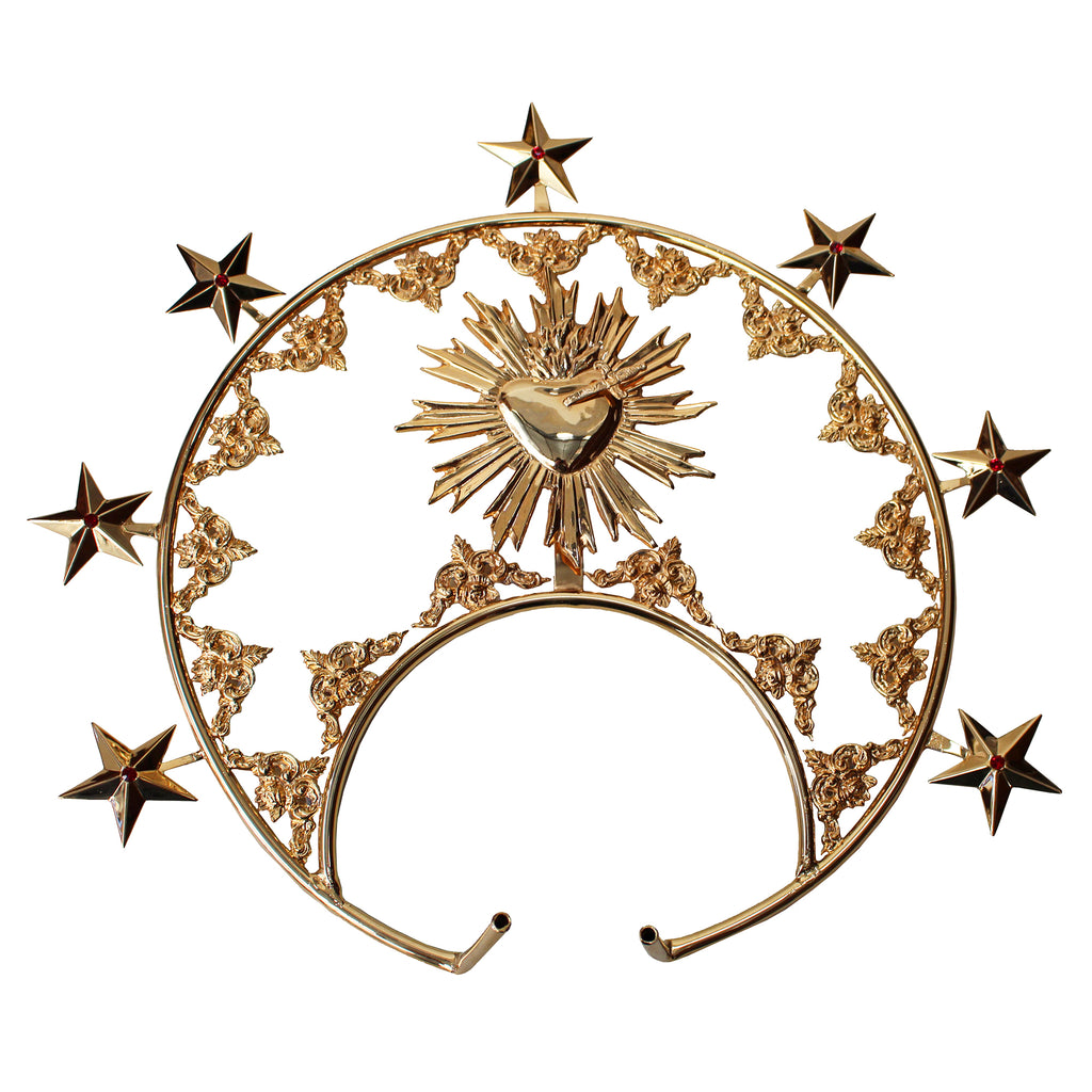Belíssimo diadema confeccionado em liga metálica fundida de alta qualidade, com acabamento em banho de ouro 24 quilates. Este modelo foi especialmente concebido para imagens de Nossa Senhora das Dores, pois contém as 7 estrelas dispostas em torno da peça, em referência às Sete Dores de Maria Santíssima. Além disso, no centro do diadema, está a representação do Imaculado Coração da Santíssima Virgem, transpassado por uma espada, conforme a Profecia de Simeão: