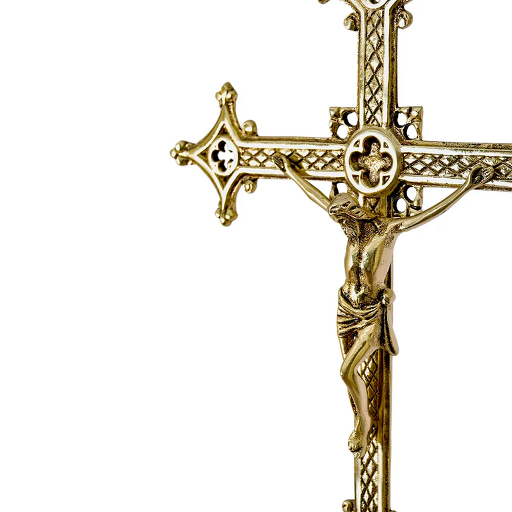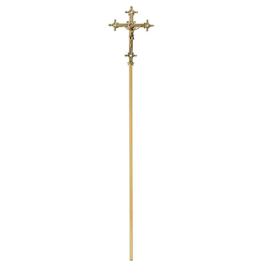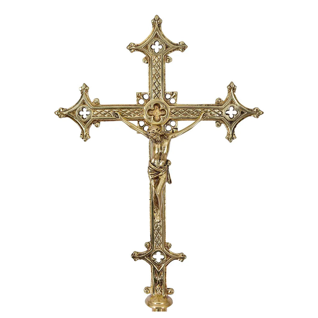 Esta é a Cruz Processional feita em bronze, peça de forte inspiração gótica. Própria para ser carregada na procissão litúrgica de entrada e saída da Santa Missa, também pode ser utilizada em cerimônias paralitúrgicas, como procissões ou rasouras.