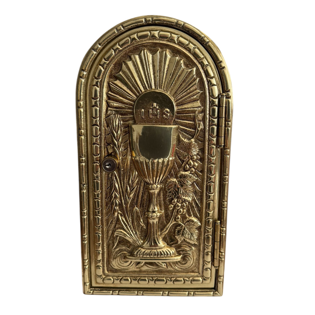 A Porta para Sacrário é o objeto perfeito para compor o local destinado a guarnecer a reserva eucarística em sua paróquia ou comunidade. Produzida em bronze, esta porta foi concebida para harmonizar-se com o conjunto arquitetônico, seja o sacrário incrustado na parede, esculpido no mármore do altar ou instalado em estrutura própria. Sua presença não apenas protege e resguarda o Santíssimo Sacramento, mas também expressa, por meio da arte e do símbolo eucarístico nela entalhado, a importância central da Eucaristia na vida da comunidade.