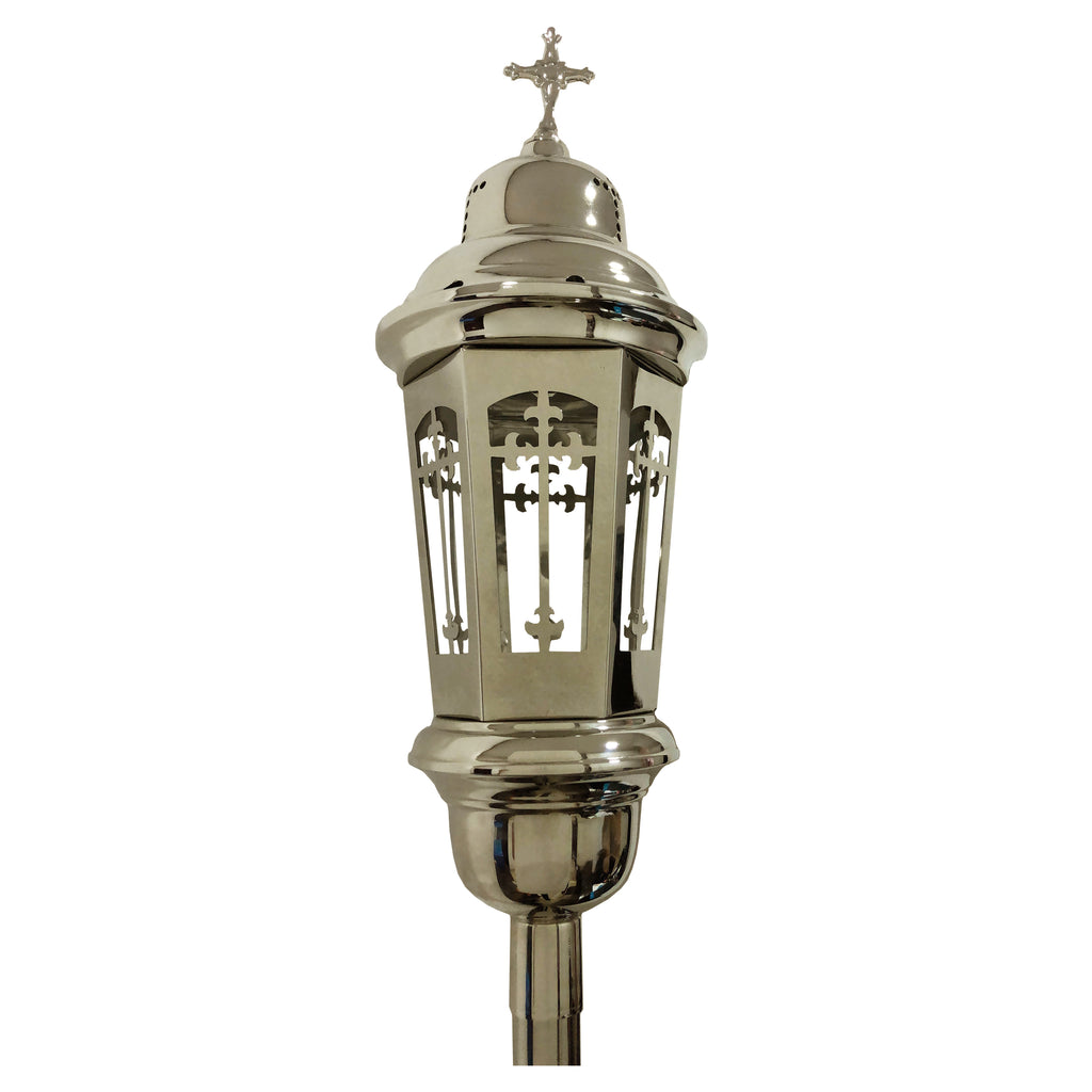 Esta é nossa Lanterna Processional Tradicional, uma peça de estilo mais sóbrio, própria para ser carregada na procissão litúrgica de entrada e saída da Santa Missa, como também em cerimônias paralitúrgicas, como procissões externas ou rasouras.