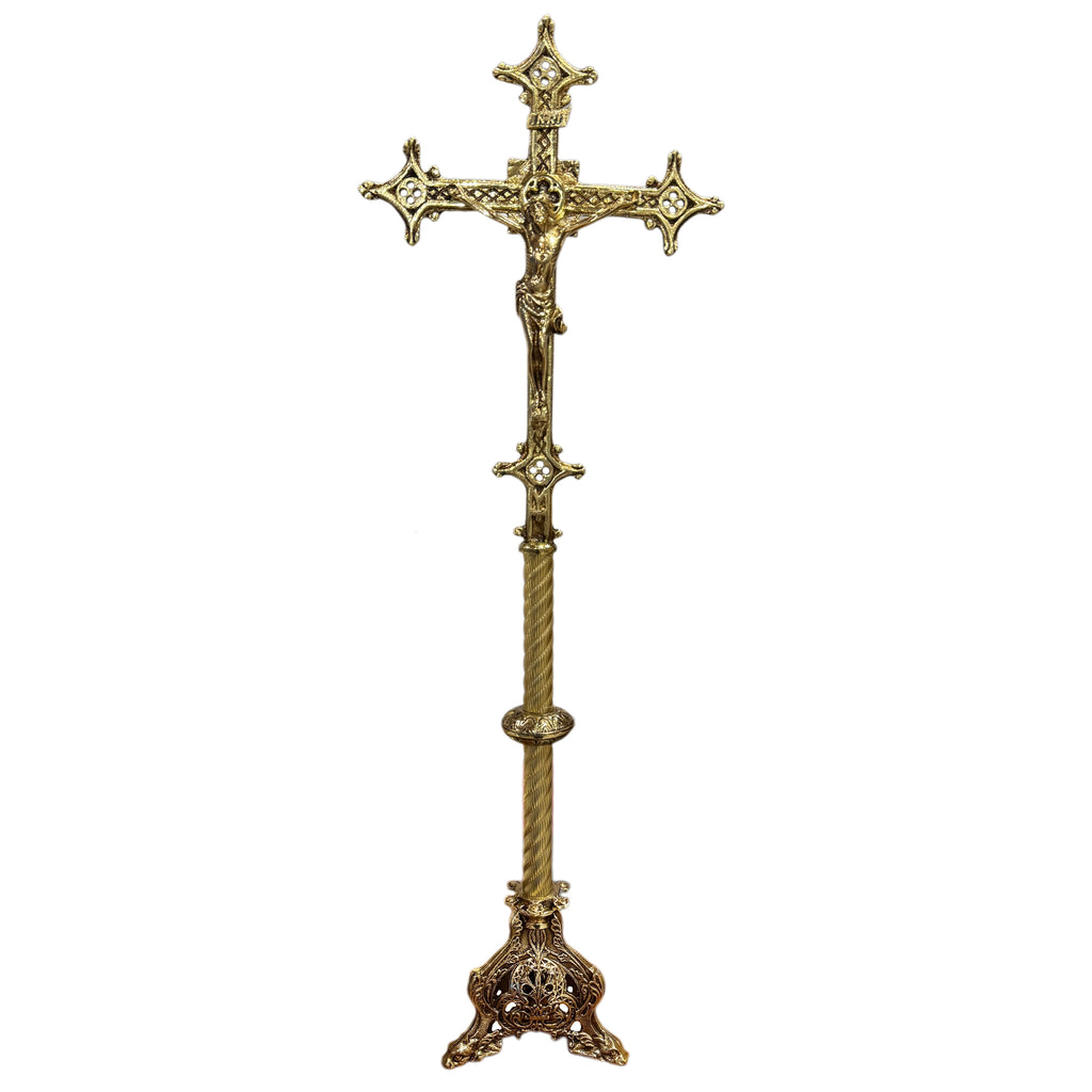 Essa é uma Cruz de Altar feita em bronze e de estilo mais trabalhado. A peça é polida e revestida com verniz para proteção. Pode ser utilizado em uma mesa ou Altar, ideal para ser utilizada durante a celebração da Santa Missa ou para um retábulo.