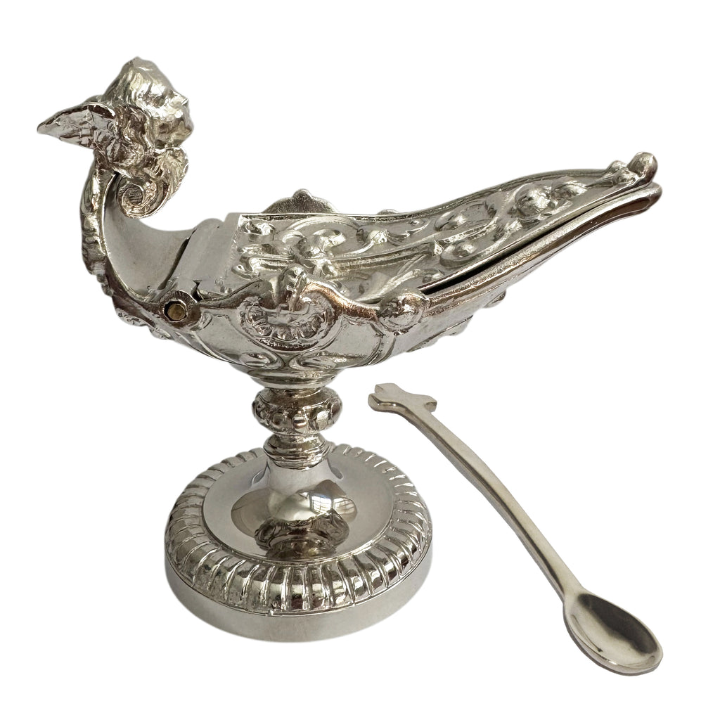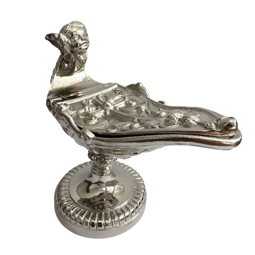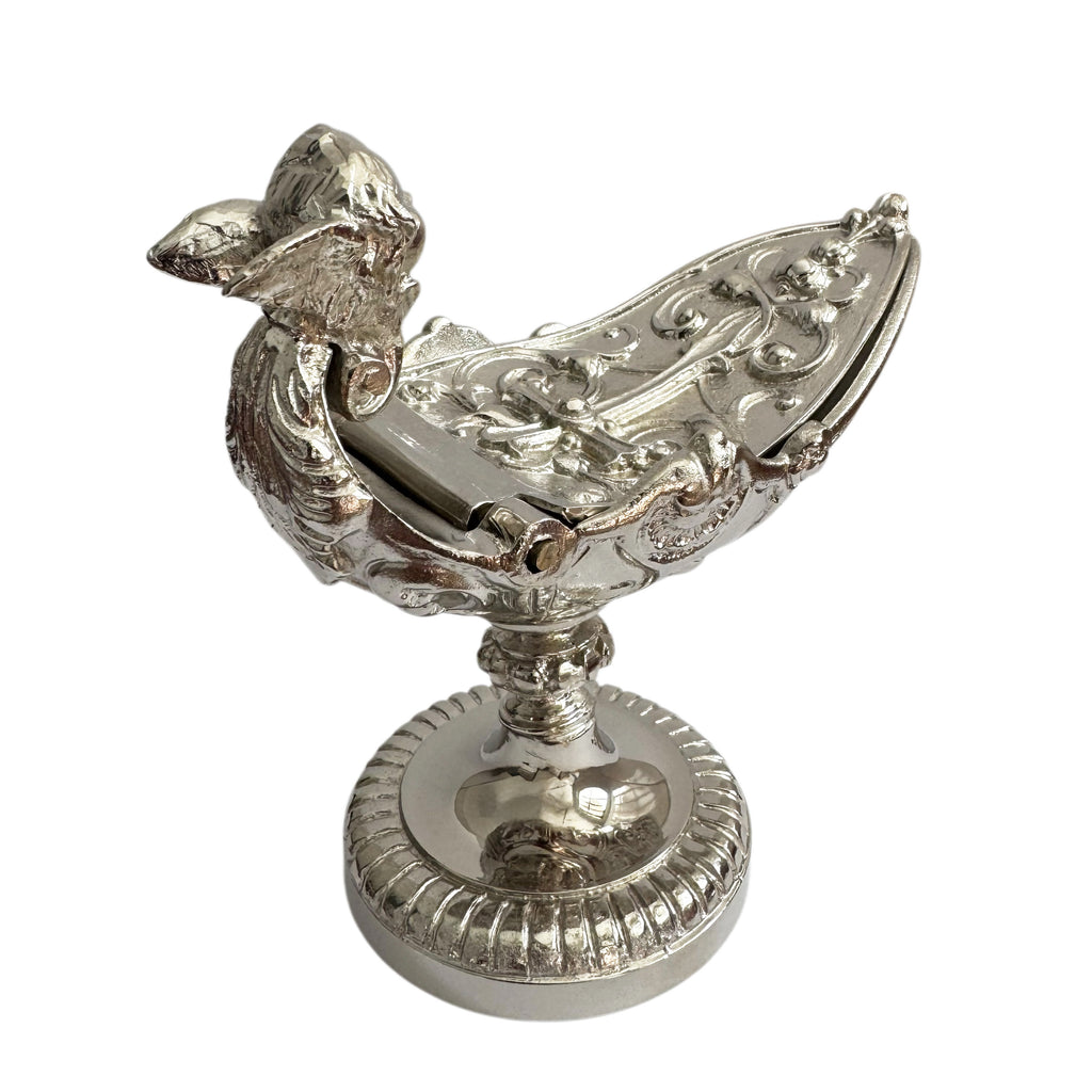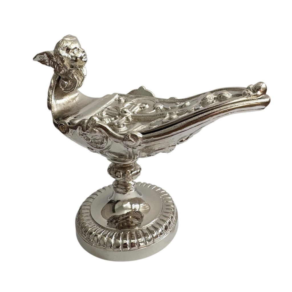 A naveta é um tradicional recipiente litúrgico em formato de um pequena navio, destinada a guardar o incenso utilizado nas celebrações litúrgicas. Este modelo é feito de liga metálica fundida preparada por nós e é integralmente banhada a níquel.