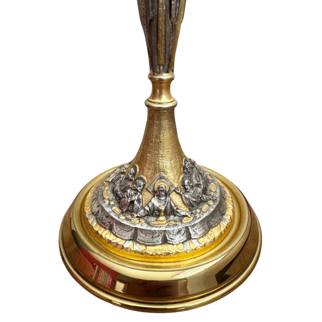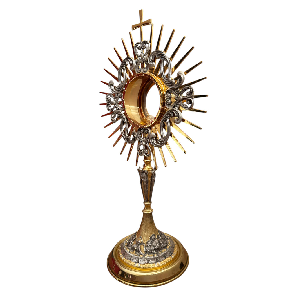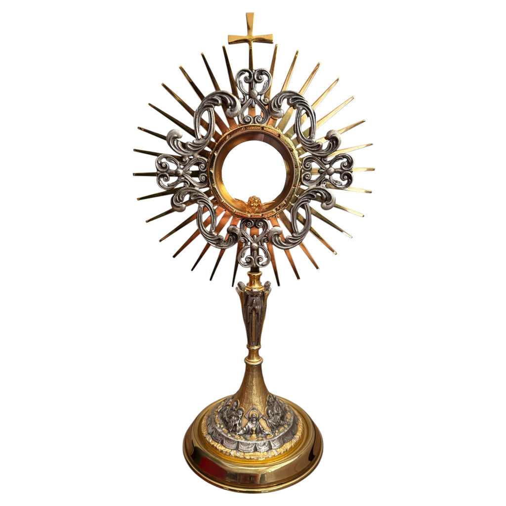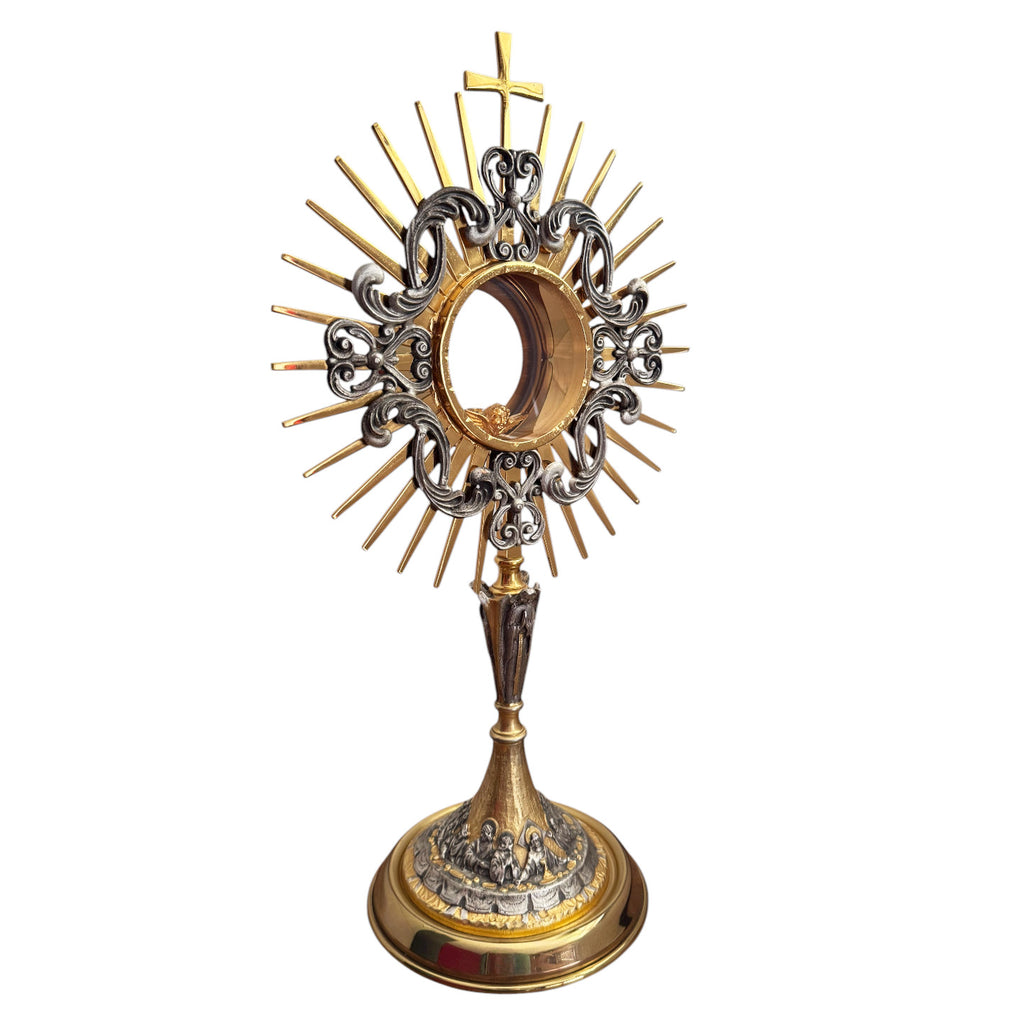 O Ostensório Italiano apresenta-se como uma opção de Custódia marcada pela nobre simplicidade, concebida com especial cuidado para oferecer ao Santíssimo Sacramento a dignidade que Lhe é devida, revestindo-O de beleza discreta e profunda reverência.Em sua base, encontra-se a representação da Santa Ceia, cena augusta na qual Nosso Senhor Jesus Cristo instituiu o Santíssimo Sacramento da Eucaristia, perpetuando, para todas as gerações, o memorial vivo do Seu Sacrifício redentor.