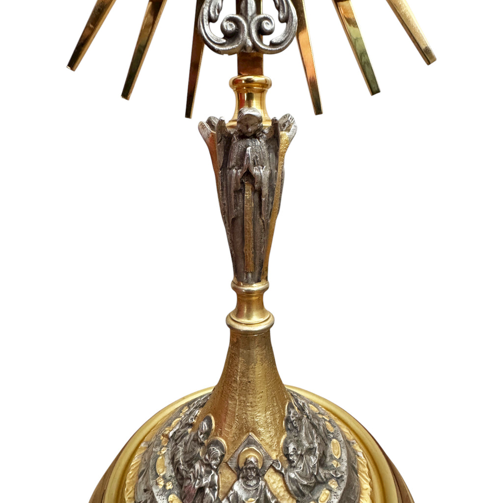De fabricação italiana, esta custódia possui ainda uma delicada e expressiva luneta em formato de anjo, cuja figura remete à adoração perpétua dos exércitos celestes diante do Trono do Altíssimo. É produzido em metal dourado, com detalhes prateados e em banho de ouro.