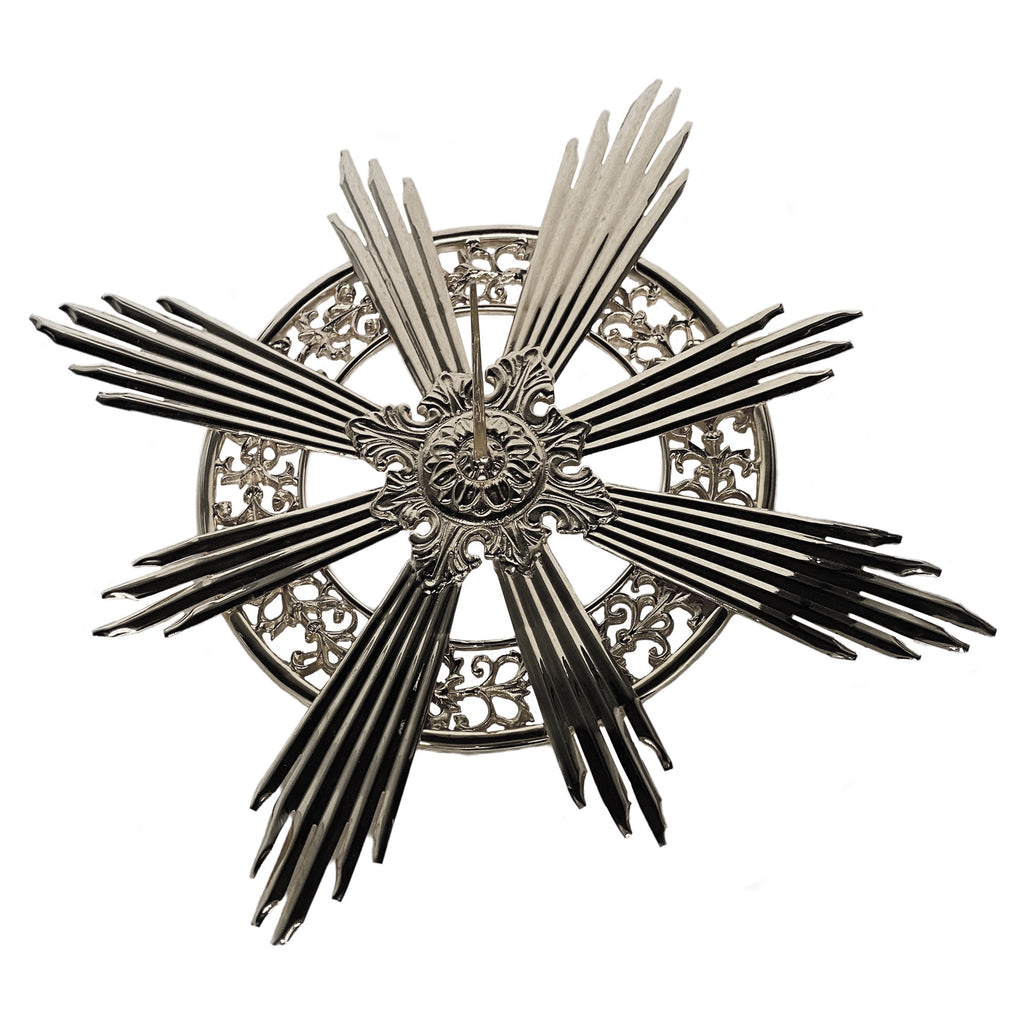 Belíssimo resplendor feito em liga metálica fundida, banhado a níquel. Esta peça possui um pino central e pode ser fixado em cima ou atrás da cabeça da imagem.