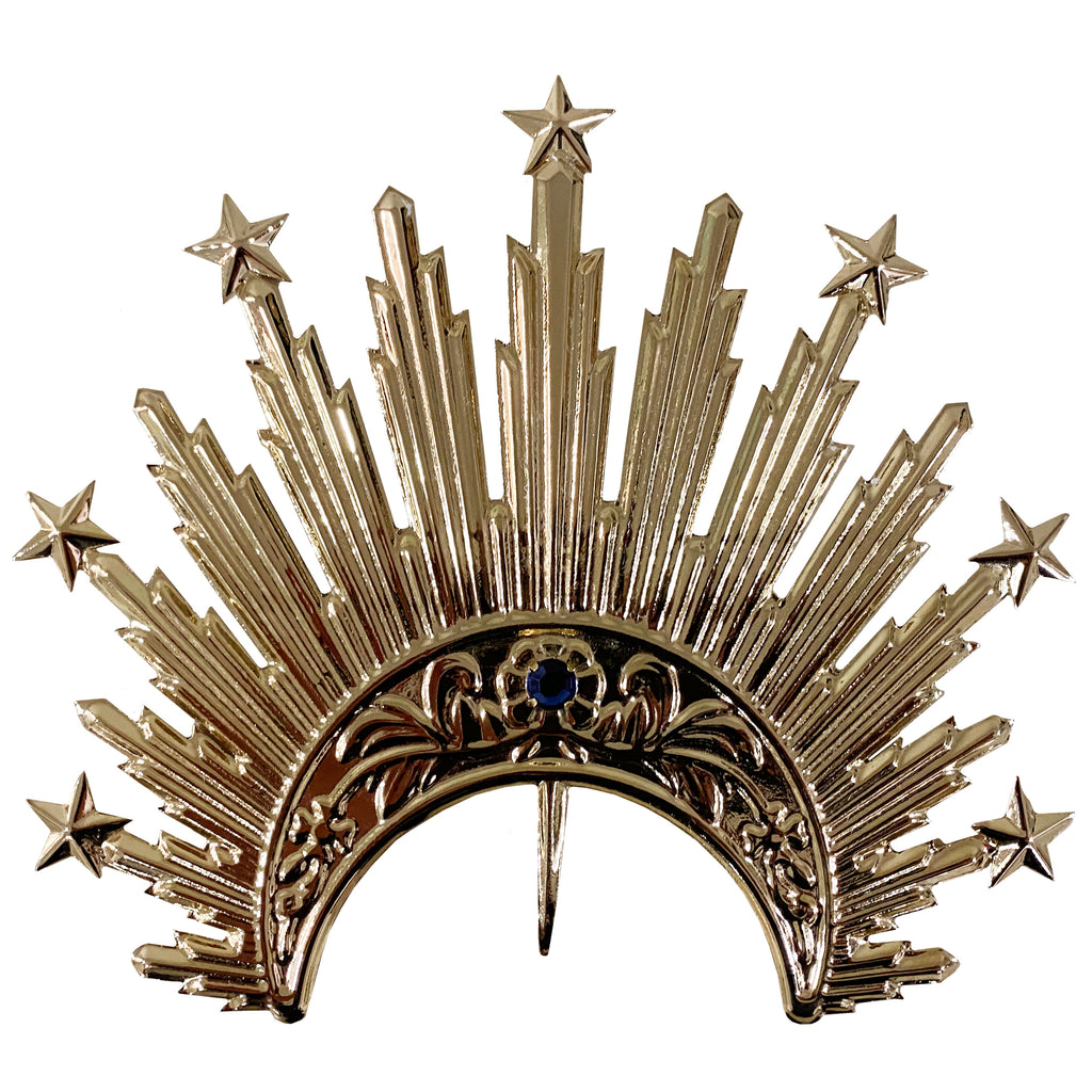 Belíssimo resplendor com sete estrelas feito em chapa de metal de alta durabilidade e resistência, banhado a ouro 24 quilates.