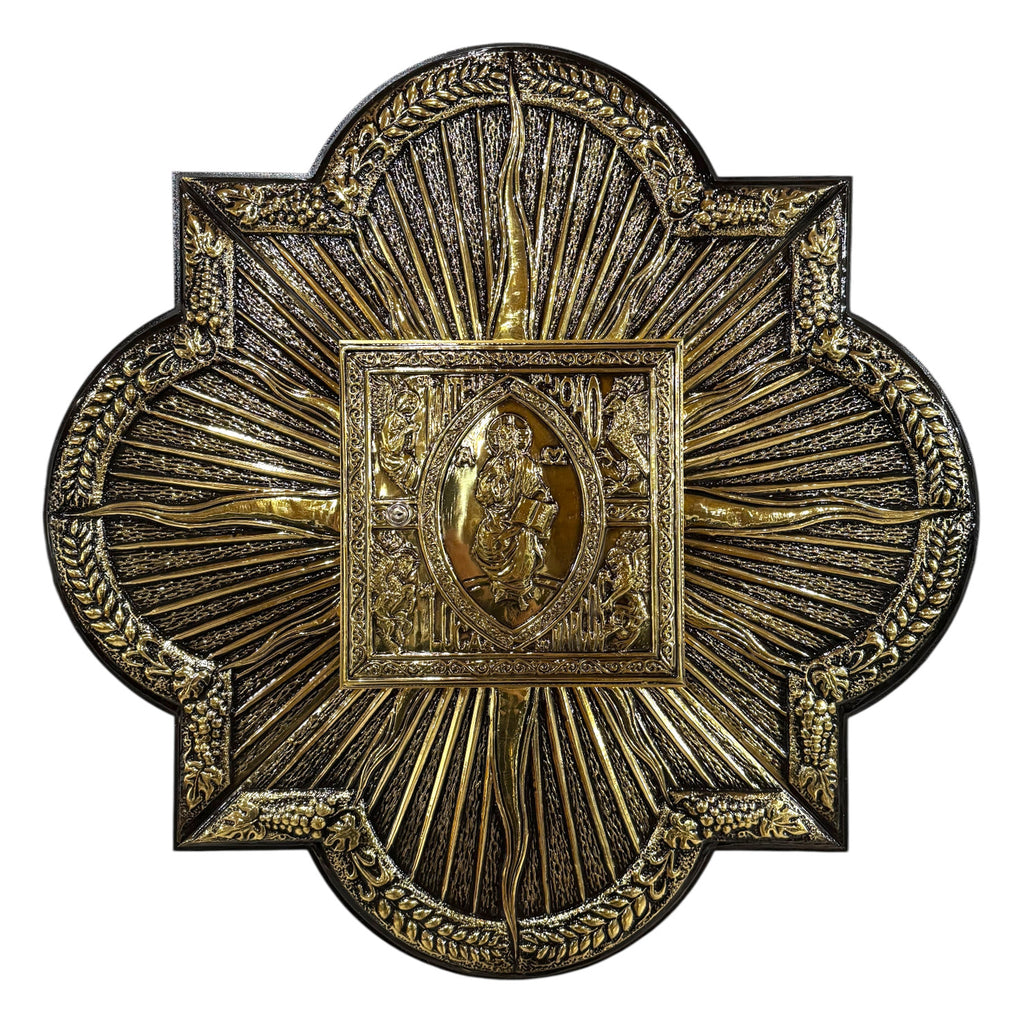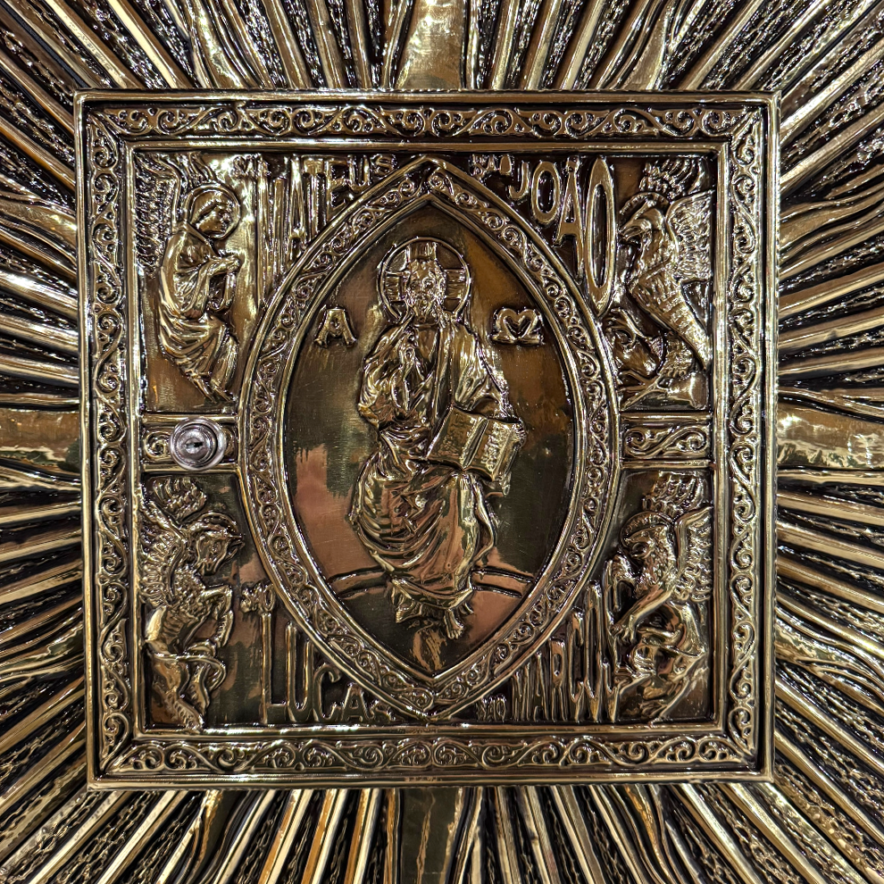 Este sacrário, cujo formato é de um característico estilo gótico, possui em destaque na sua porta a imagem do Cristo Pantokrator. Ao redor, encontra-se o tetramorfo, isto é, as representações figurativas dos Quatro Evangelistas: Mateus, representado por um Anjo; Marcos, representado por um Leão; Lucas, representado por um Touro; e João, representado por uma Águia.