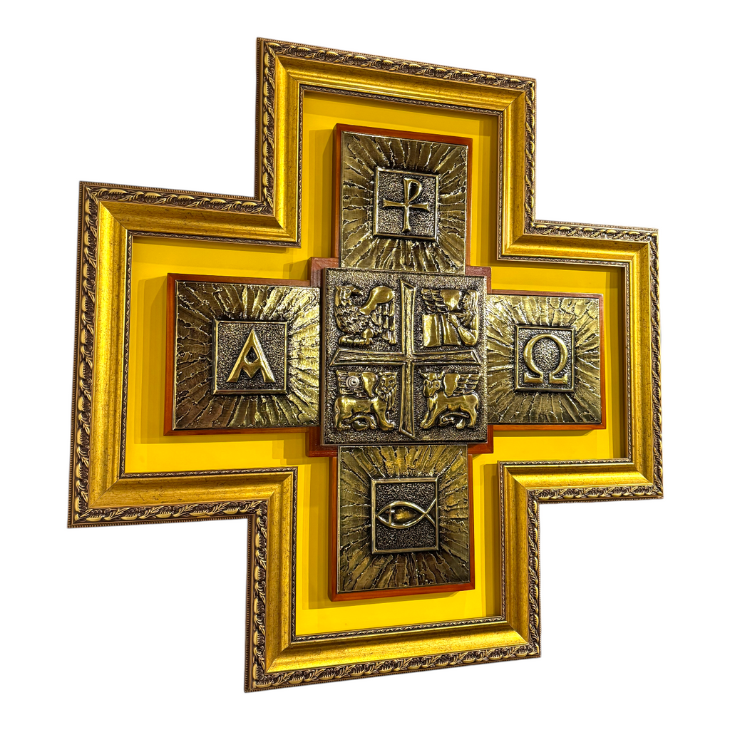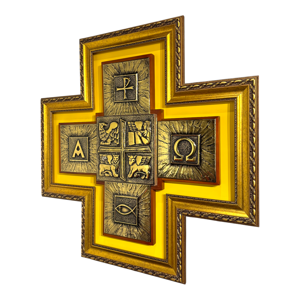 Na porta, destaca-se o tetramorfo, isto é, as representações figurativas dos Quatro Evangelistas: Mateus, representado por um Anjo; Marcos, representado por um Leão; Lucas, representado por um Touro; e João, representado por uma Águia. No alto da cruz, está o Cristograma XP, as iniciais do nome do Senhor em grego; na parte inferior, o desenho de um peixe, símbolo dos primeiros cristãos; e, nas laterais, as iniciais gregas alfa e ômega, símbolos do Cristo, princípio e fim de todas as coisas.
