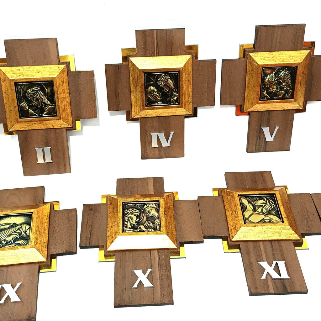 Com uma bela moldura em madeira em forma de cruz, este modelo de quadros da via-sacra apresenta as imagens em seu interior feitas em metal. É mais indicado para capelas e igrejas pequenas.
