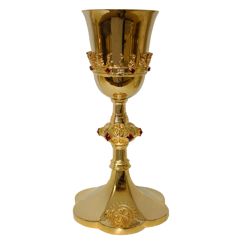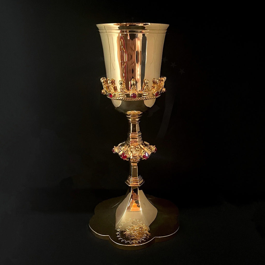 Inspirado na tradição gótica, este belo cálice possui alegorias que fazem referência a elementos desse período: na base, está a cruz pátea, símbolo dos Cavaleiros Medievais; no copo, a grade, cujo estilo relembra as grandes fortalezas da Idade Média. No cálice, elas de fato guarnecem o Tesouro dos tesouros: o preciosíssimo Sangue de Nosso Senhor Jesus Cristo.