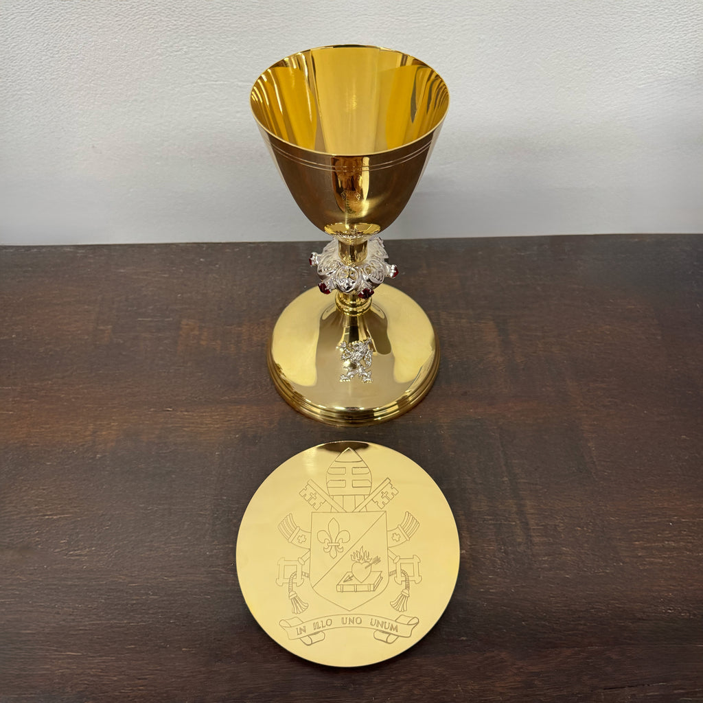 Este é o Cálice dedicado ao Santo Padre, o Papa Leão XIV, lançado na aurora de seu glorioso Pontificado. Ele pode acompanhar, à sua escolha, a patena com o brasão do Santo Padre. Na base, encontra-se a figura do Leão, em referência ao nome escolhido pelo Papa, como também à figura heráldica do leão na arte cristã, símbolo de Cristo, profetizado nas Sagradas Escrituras como o "Leão da Tribo de Judá."