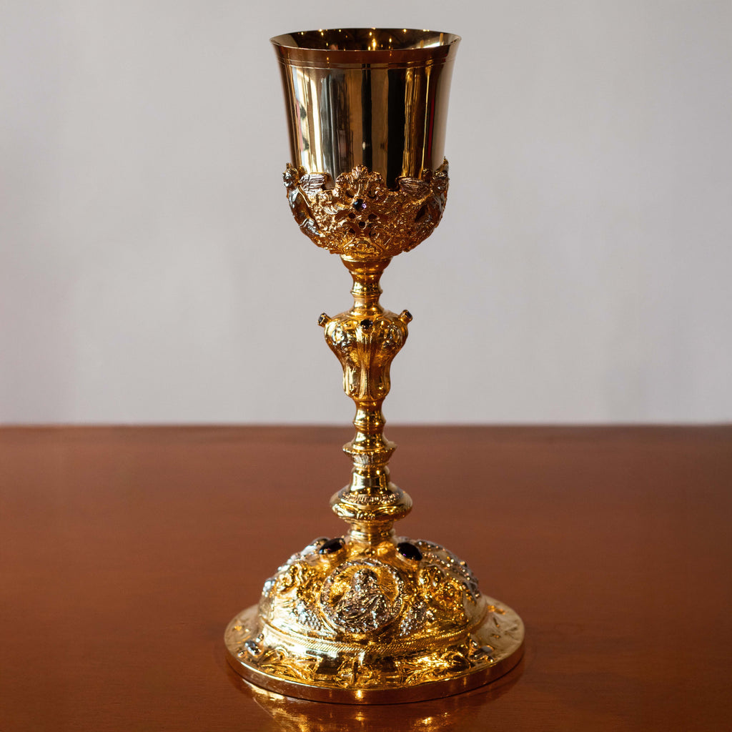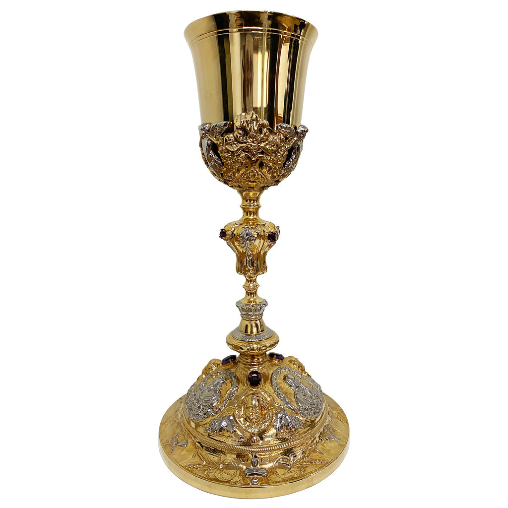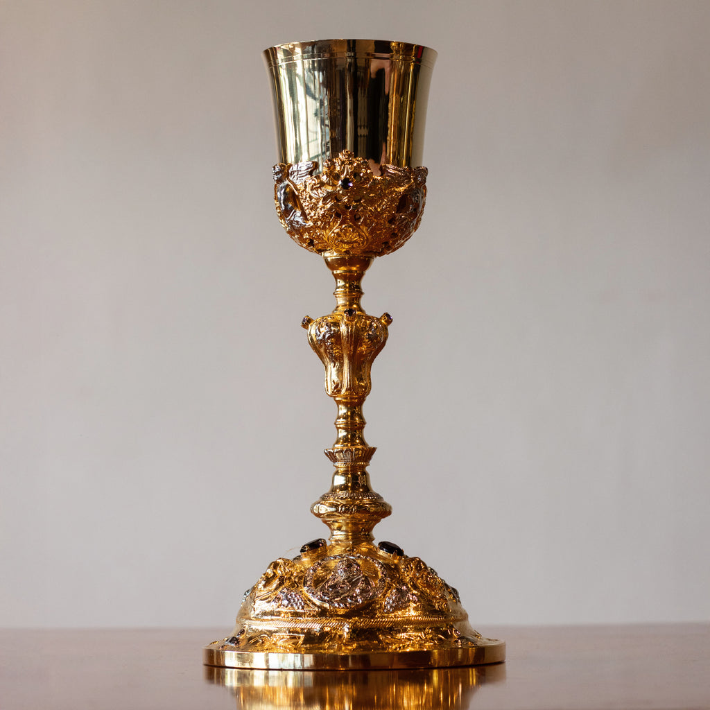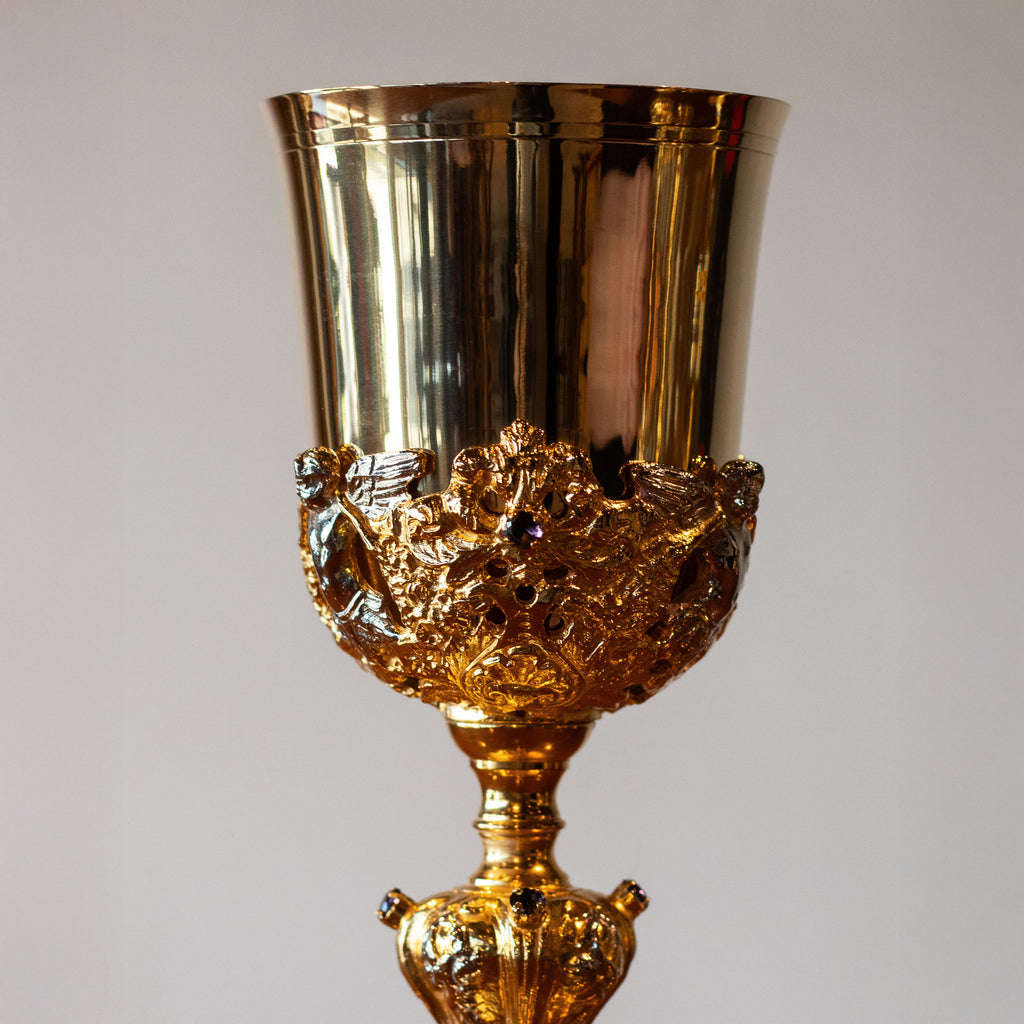 Confeccionado em liga metálica fundida de altíssima qualidade, este cálice possui um banho misto de ouro e níquel em sua coluna e base, o que realça ainda mais seus detalhes. O copo, feito em latão, nome dado à liga metálica de cobre e zinco, é banhado a ouro 24 quilates.