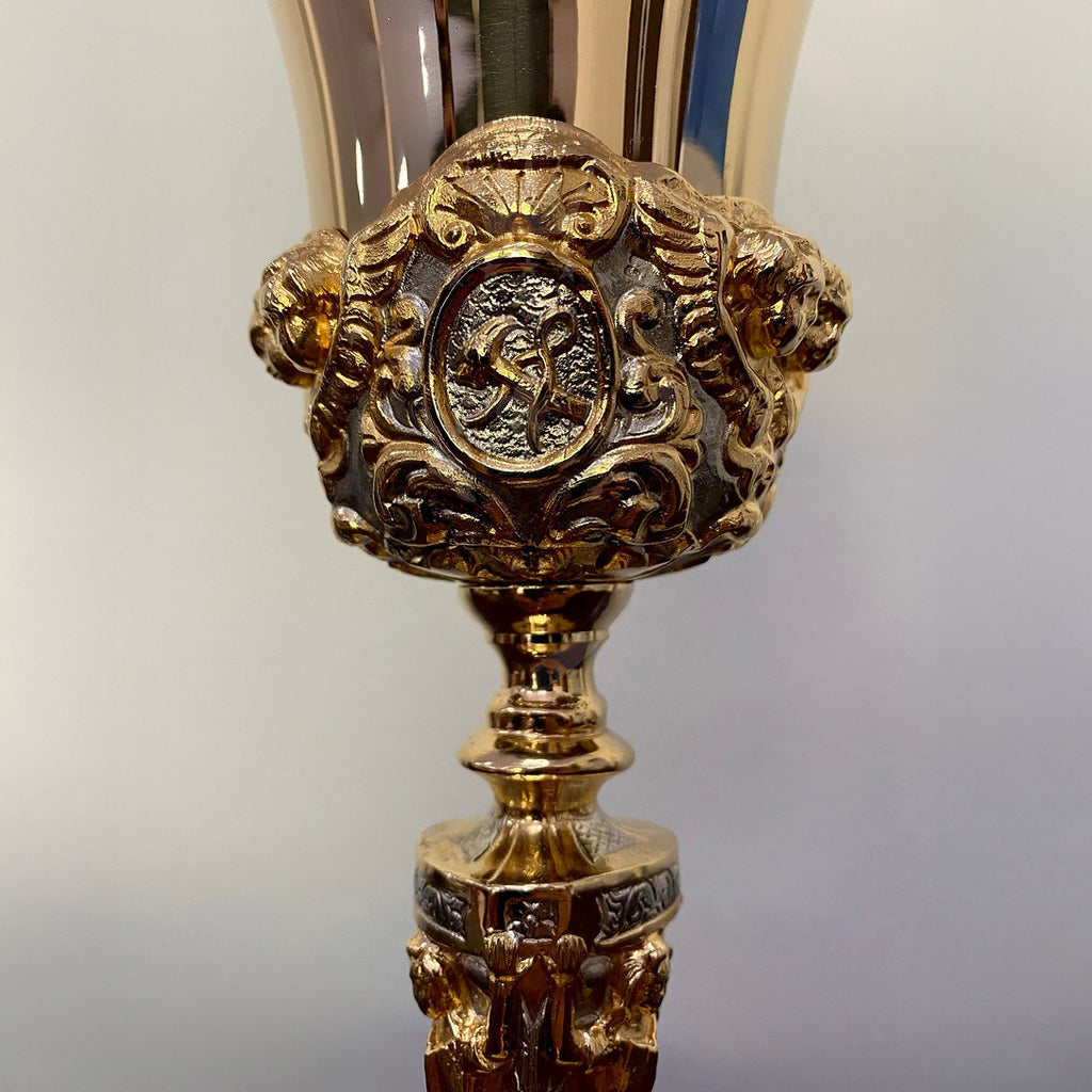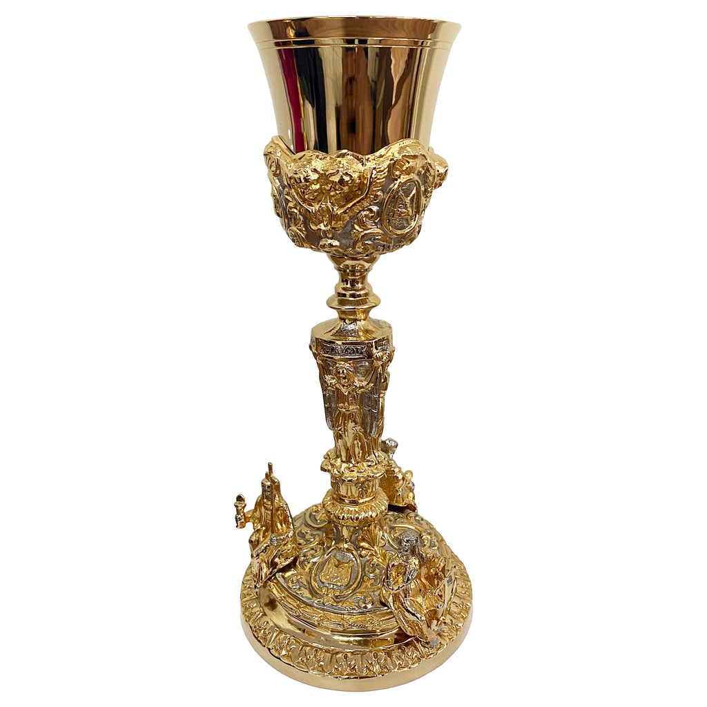 Com um estilo de vaso sagrado muito peculiar à Cidade Eterna, este belíssimo cálice possui como temas predominantes as Três Virtudes Teologais e a Paixão de Nosso Senhor Jesus Cristo. Na base, as três mulheres representam as Virtudes: a que segura a Cruz e o Cálice Eucarístico é símbolo da Fé; a mulher que ampara uma criança simboliza a Caridade; e a mulher que porta uma âncora é sinal da Esperança.