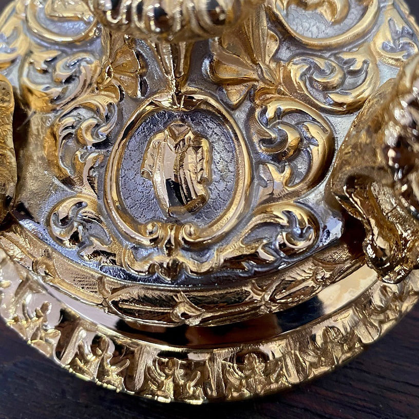 Confeccionado em liga metálica fundida de altíssima qualidade, este cálice possui um banho misto de ouro e níquel em sua coluna e base, o que realça ainda mais seus detalhes. O copo, feito em latão, nome dado à liga metálica de cobre e zinco, é banhado a ouro 24 quilates.