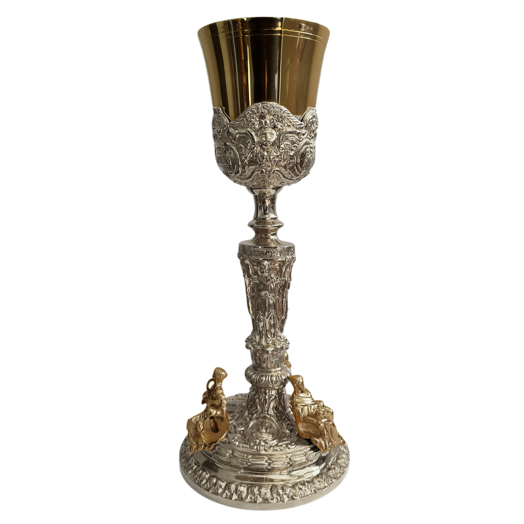 Com um estilo de vaso sagrado muito peculiar à Cidade Eterna, este belíssimo cálice possui como temas predominantes as Três Virtudes Teologais e a Paixão de Nosso Senhor Jesus Cristo. Na base, as três mulheres representam as Virtudes: a que segura a Cruz e o Cálice Eucarístico é símbolo da Fé; a mulher que ampara uma criança simboliza a Caridade; e a mulher que porta uma âncora é sinal da Esperança.