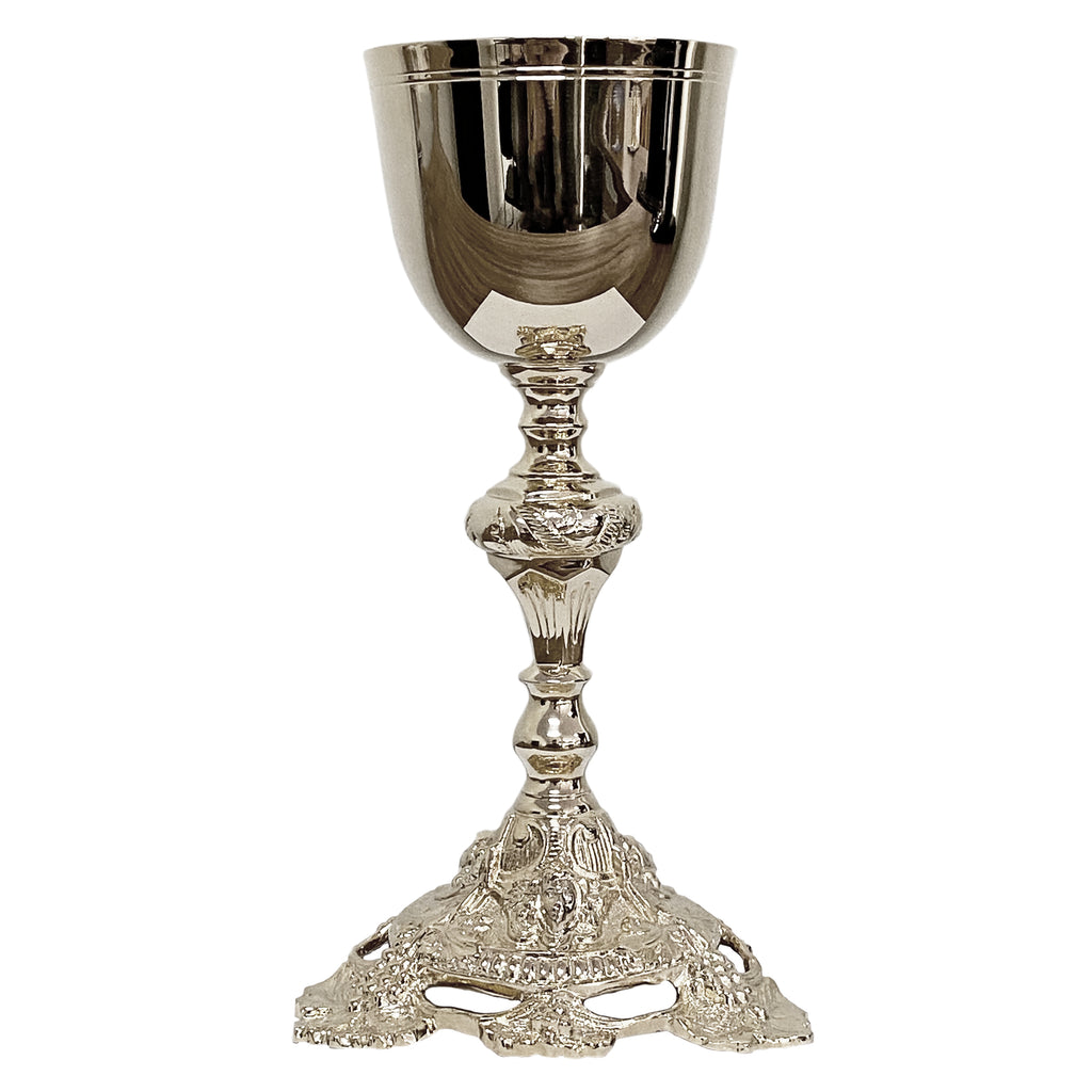 Com uma coluna e base ricas em detalhes, esse é um cálice que apresenta uma nobre simplicidade. Pelo seu tamanho, é ideal para a celebração cotidiana da Santa Missa, como também para uma capela ou comunidade. Confeccionado em latão, nome dado à liga metálica de cobre e zinco de altíssima qualidade, esta versão é banhada a níquel.