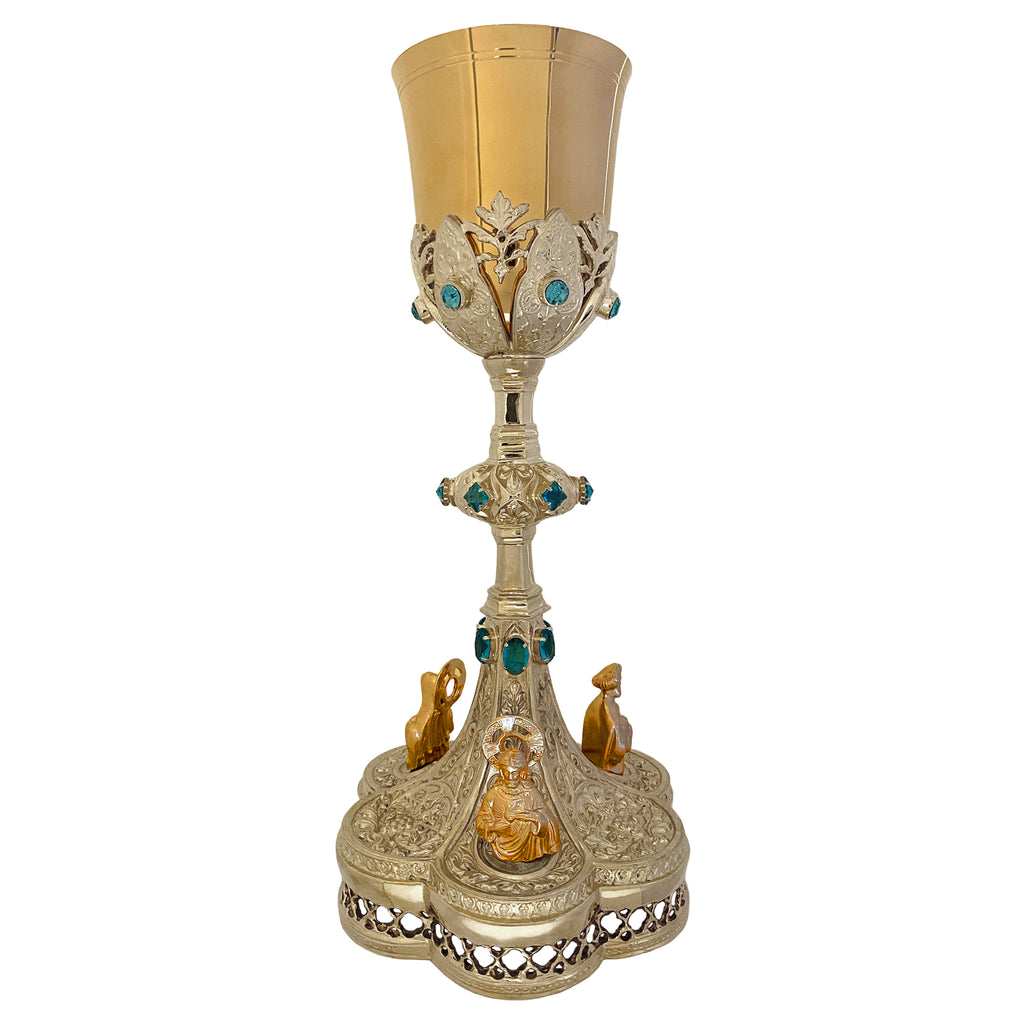 Confeccionado em liga metálica fundida de altíssima qualidade, este cálice é banhado a níquel em sua coluna e base. O copo, feito em latão, nome dado à liga metálica de cobre e zinco, é banhado a ouro 24 quilates, bem como os apliques em sua base.