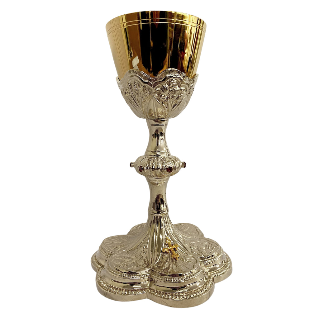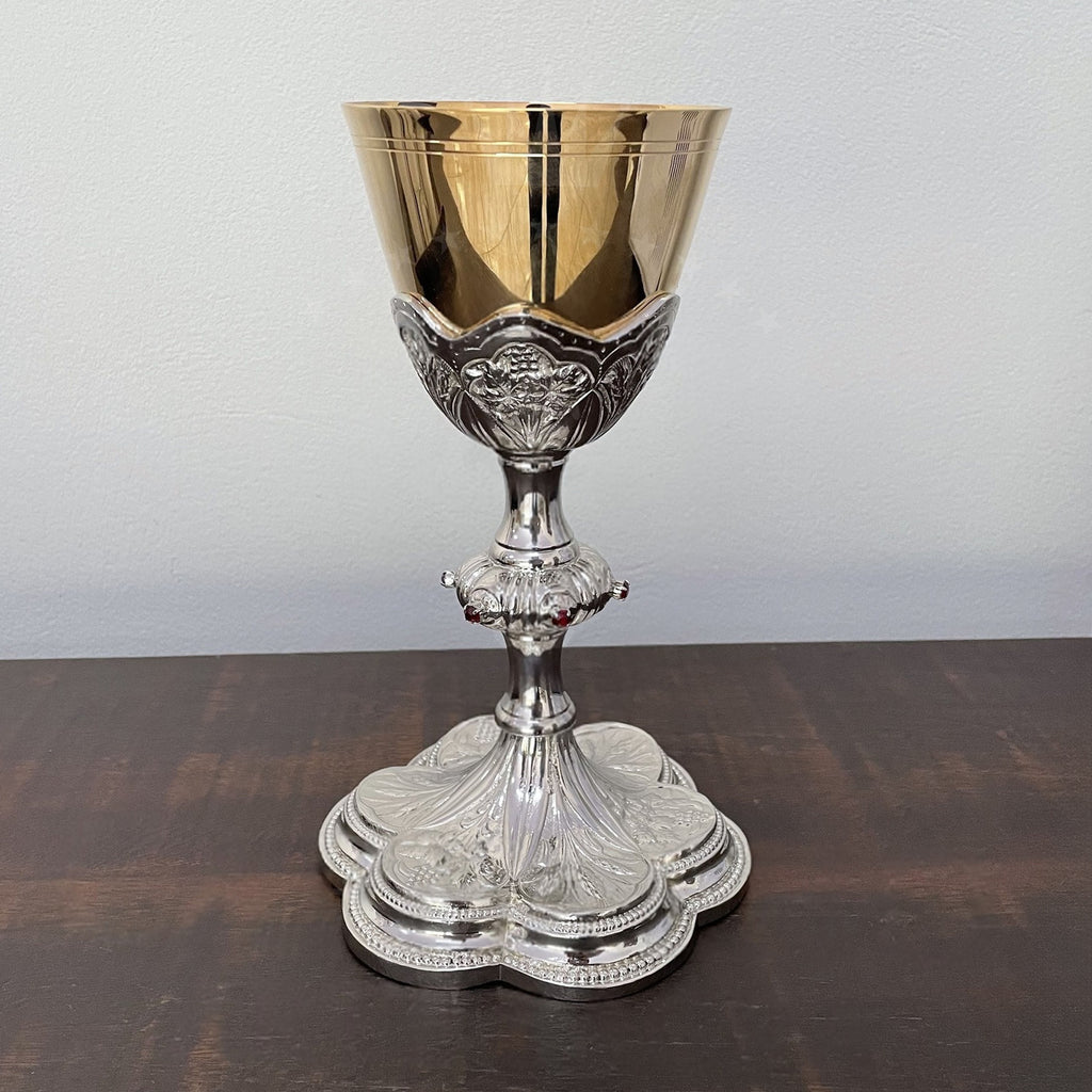 Com delicados detalhes em relevo de trigo e uva em sua base, este cálice remete aos elementos essenciais da Eucaristia: o pão e o vinho, frutos da terra e do trabalho humano, que se tornam Corpo e Sangue de Cristo. O trigo, que precisa ser moído, e a uva, que deve ser esmagada, simbolizam o mistério da Paixão do Senhor. É pelo sacrifício — pela entrega — que nasce a vida nova. Assim como o grão que morre para dar fruto e a videira que é podada para amadurecer o vinho, também Cristo, por Sua Cruz, nos oferece a salvação.