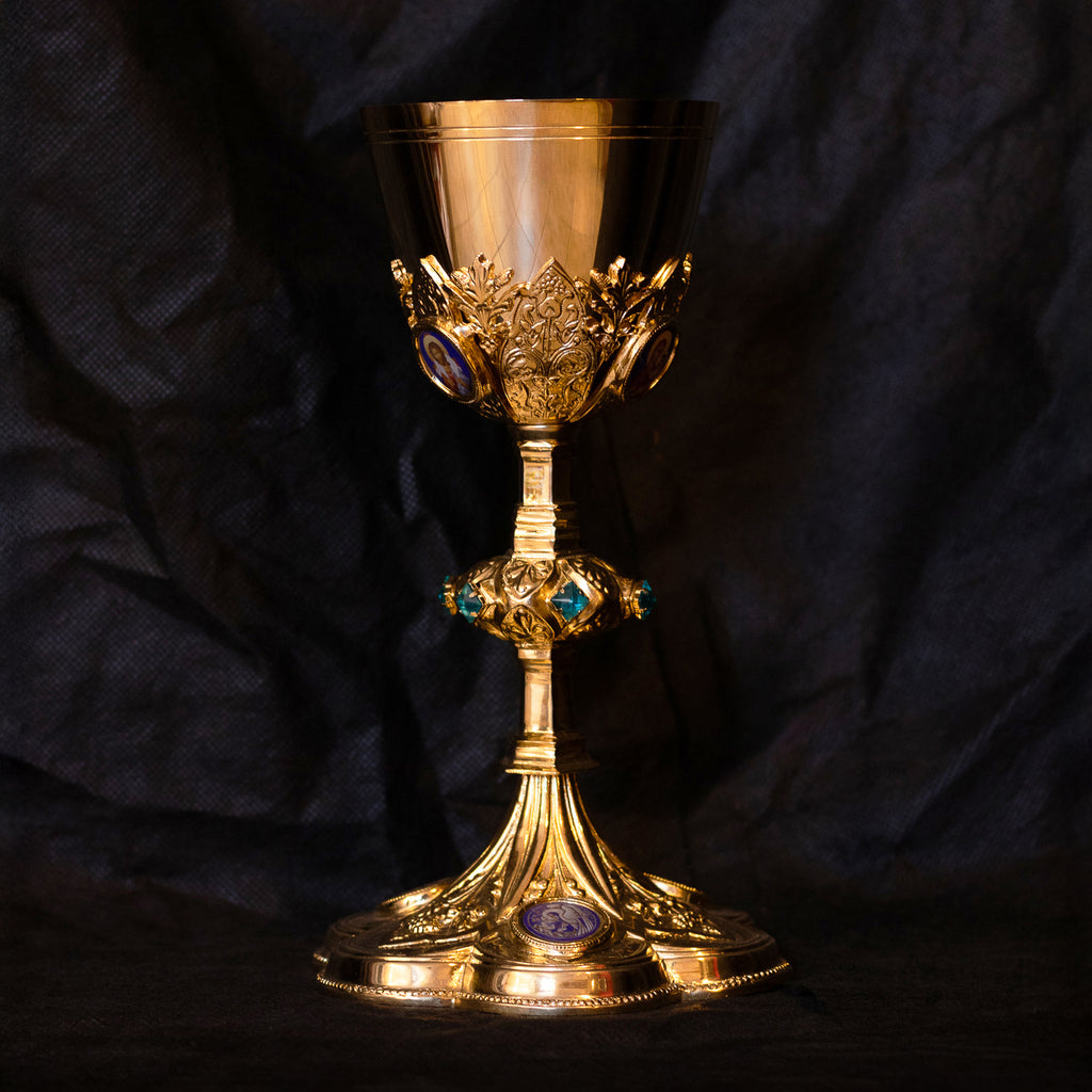 Na grade ao redor de seu copo, estão os ícones de Nossa Senhora, a Toda Santa Mãe de Deus, de Nosso Senhor, o Bom Pastor, e de São José, o Patrono da Santa Igreja. Na base do cálice, encontram-se as representações do Pio Pelicano, Divino Espírito Santo e Cordeiro de Deus.