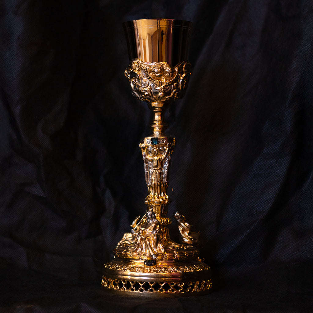 Com um estilo de vaso sagrado muito peculiar à Cidade Eterna, este belíssimo cálice possui como temas predominantes as Três Virtudes Teologais e a Paixão de Nosso Senhor Jesus Cristo. Na base, as três mulheres representam as Virtudes: a que segura a Cruz e o Cálice Eucarístico é símbolo da Fé; a mulher que ampara uma criança simboliza a Caridade; e a mulher que porta uma âncora é sinal da Esperança.