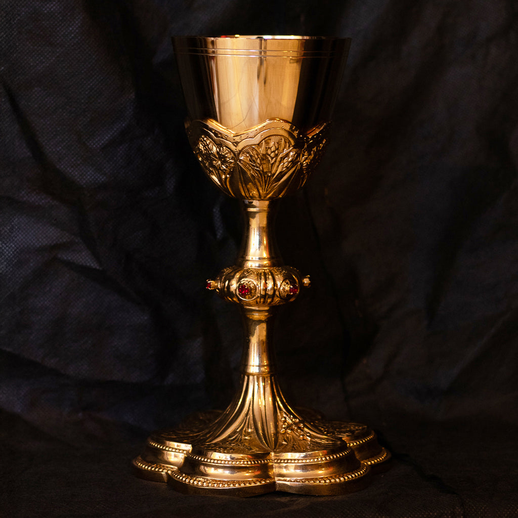 Com delicados detalhes em relevo de trigo e uva em sua base, este cálice remete aos elementos essenciais da Eucaristia: o pão e o vinho, frutos da terra e do trabalho humano, que se tornam Corpo e Sangue de Cristo. O trigo, que precisa ser moído, e a uva, que deve ser esmagada, simbolizam o mistério da Paixão do Senhor. É pelo sacrifício — pela entrega — que nasce a vida nova. Assim como o grão que morre para dar fruto e a videira que é podada para amadurecer o vinho, também Cristo, por Sua Cruz, nos oferece a salvação.