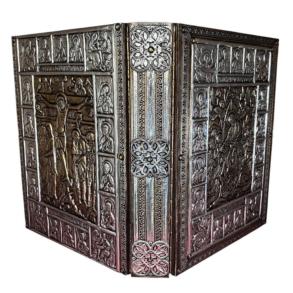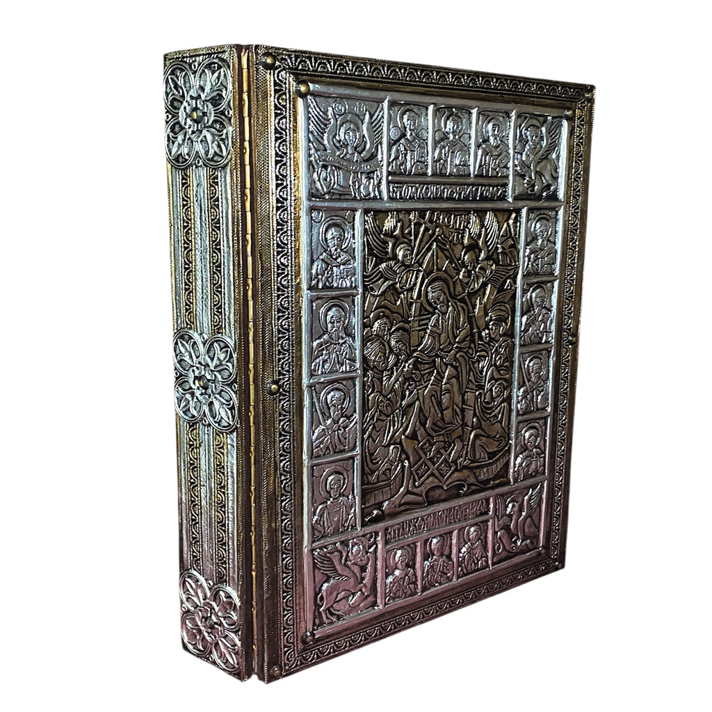 Feita totalmente em metal, esta Capa de Evangeliário é ainda toda forrada de veludo vermelho por dentro, para receber com segurança e proteger o Livro dos Evangelhos.