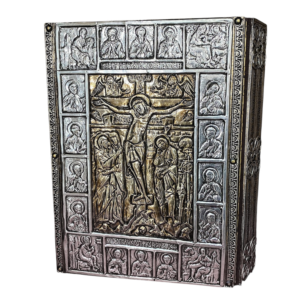 Esta é uma Capa de Evangeliário de estilo predominantemente oriental, tendo na frente a imagem de Cristo, rodeado pelos santos e apóstolos. Nos quatro cantos da peça, encontra-se o tetramorfo, isto é, as representações figurativas dos Quatro Evangelistas: Mateus, representado por um Anjo; Marcos, representado por um Leão; Lucas, representado por um Touro; e João, representado por uma Águia. Na contra-capa, destaca-se a cena da Crucifixão do Senhor.