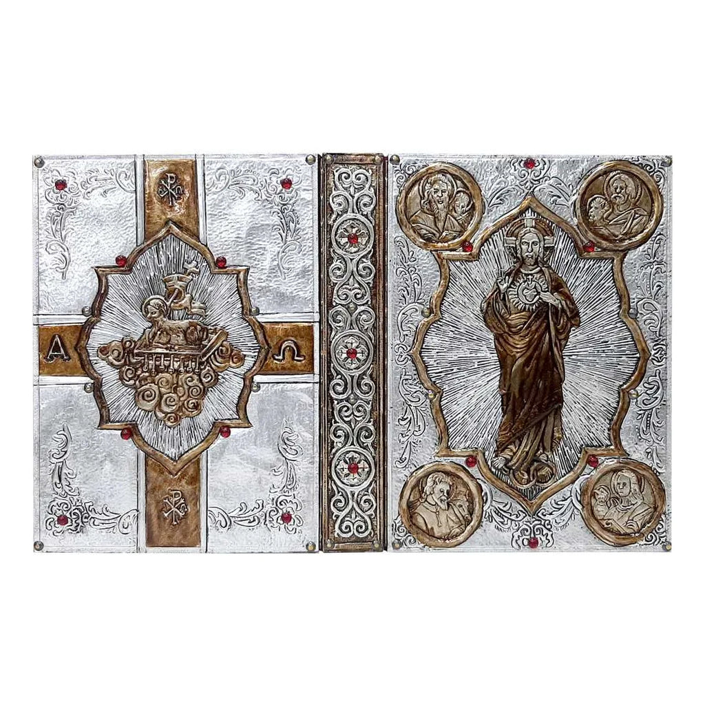 Feita totalmente em metal, esta Capa de Evangeliário é ainda toda forrada de veludo vermelho por dentro, para receber com segurança e proteger o Livro dos Evangelhos.