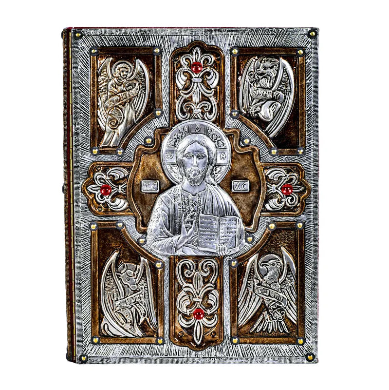 Feita totalmente em metal, esta Capa de Evangeliário é ainda toda forrada de veludo vermelho por dentro, para receber com segurança e proteger o Livro dos Evangelhos.
