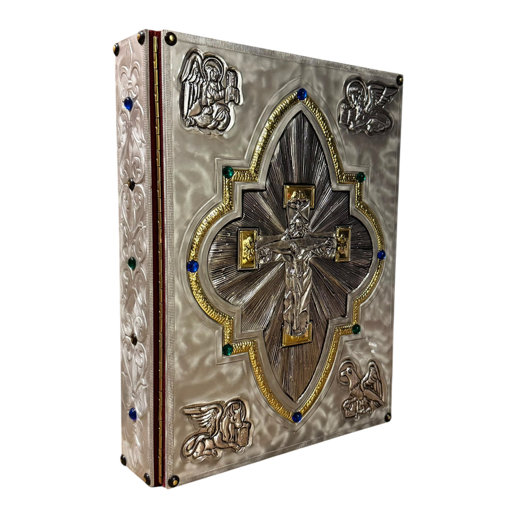 Nesta Capa de Evangeliário, destaca-se ao centro a imagem da Santíssima Trindade: o Cristo Crucificado, encimado pela representação do Pai e pela pomba do Divino Espírito Santo, sinais do mistério de Deus Uno e Trino. Nos quatro cantos, encontra-se o tetramorfo, isto é, as representações figurativas dos Quatro Evangelistas: Mateus, representado por um Anjo; Marcos, representado por um Leão; Lucas, representado por um Touro; e João, representado por uma Águia. Na contra-capa, destaca-se a figura do Cordeiro de Deus.