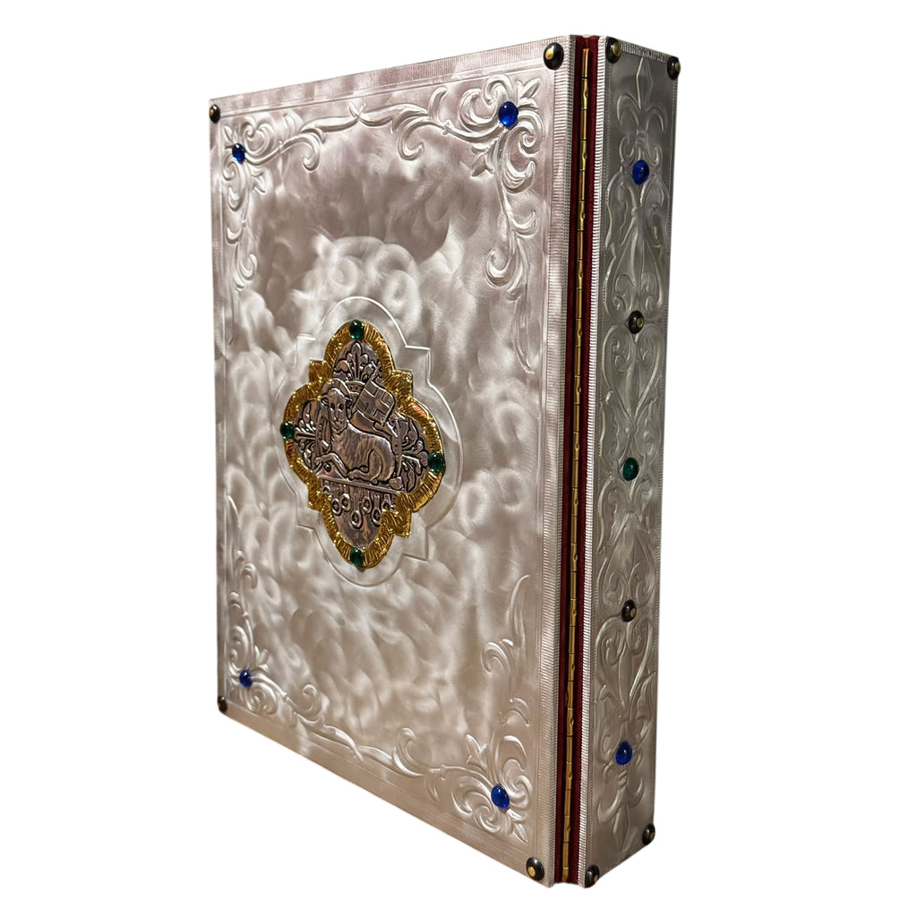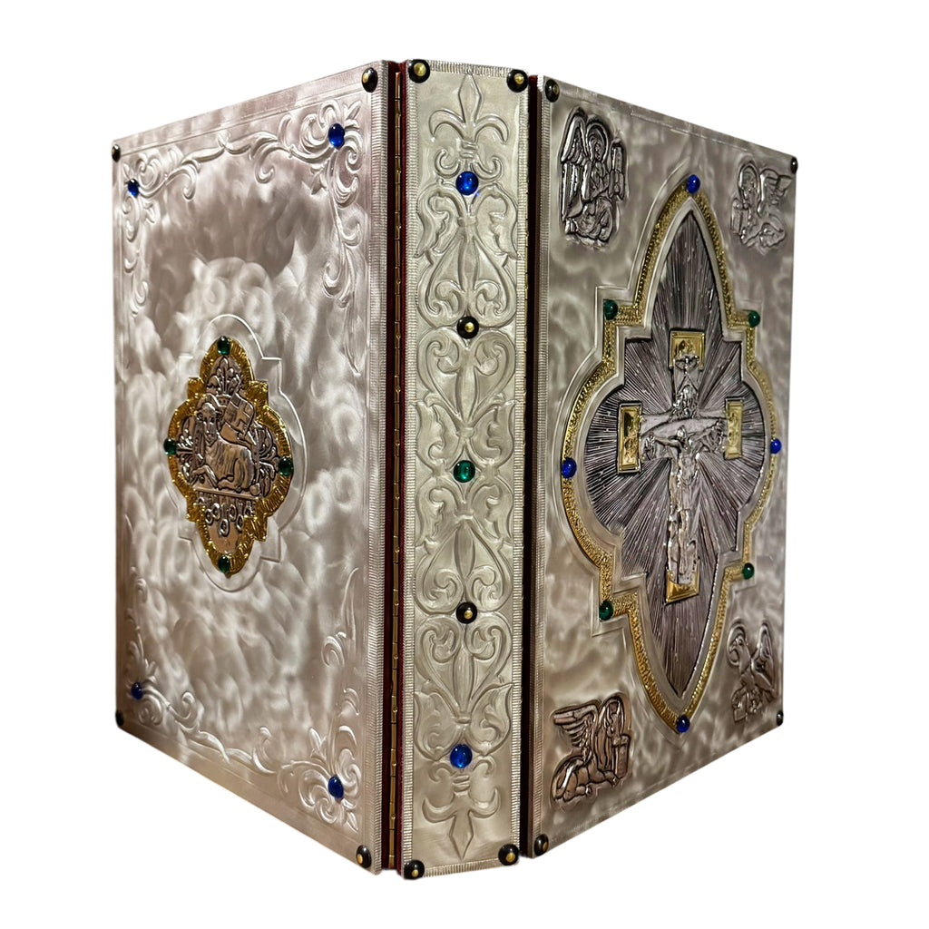 Feita totalmente em metal, esta Capa de Evangeliário é ainda toda forrada de veludo vermelho por dentro, para receber com segurança e proteger o Livro dos Evangelhos.