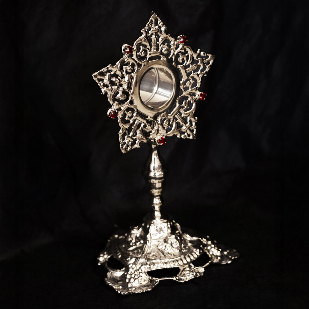 Este é o Relicário Tradicional, uma piedosa e singela peça para você guarnecer a relíquia de seu santo de devoção em um local digno para ser venerada. Pelas suas dimensões, é o relicário ideal para sua casa, para a sacristia de sua Paróquia ou mesmo para a veneração pública dos fiéis. Feito em liga metálica fundida de altíssima qualidade e preparada por nós, além de adornado com uma bela pedraria, este modelo é banhado a níquel.